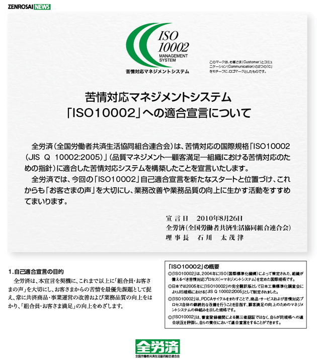 当会は、2010年8月26日に開催した「第106回通常総会」におきまして、苦情対応プロセスの国際規格「ISO 10002(JIS Q 10002)」に適合した苦情対応システムを構築したことを共済団体として初めて宣言しました。