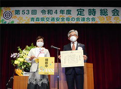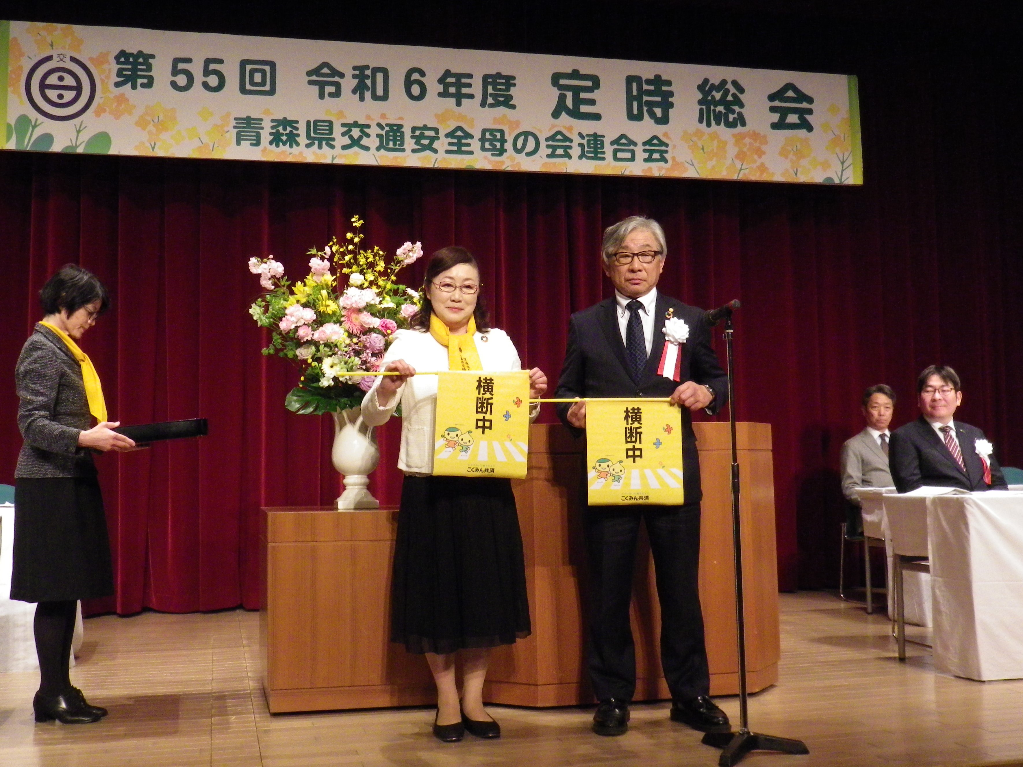 青森県交通安全母の会連合会の定時総会にて、横断旗3,700本を寄贈しました。横断旗は県内7市の交通安全母の会を通じて各市の小学校へ提供され、各地域での登下校時のボランティア活動で使用いただきます。