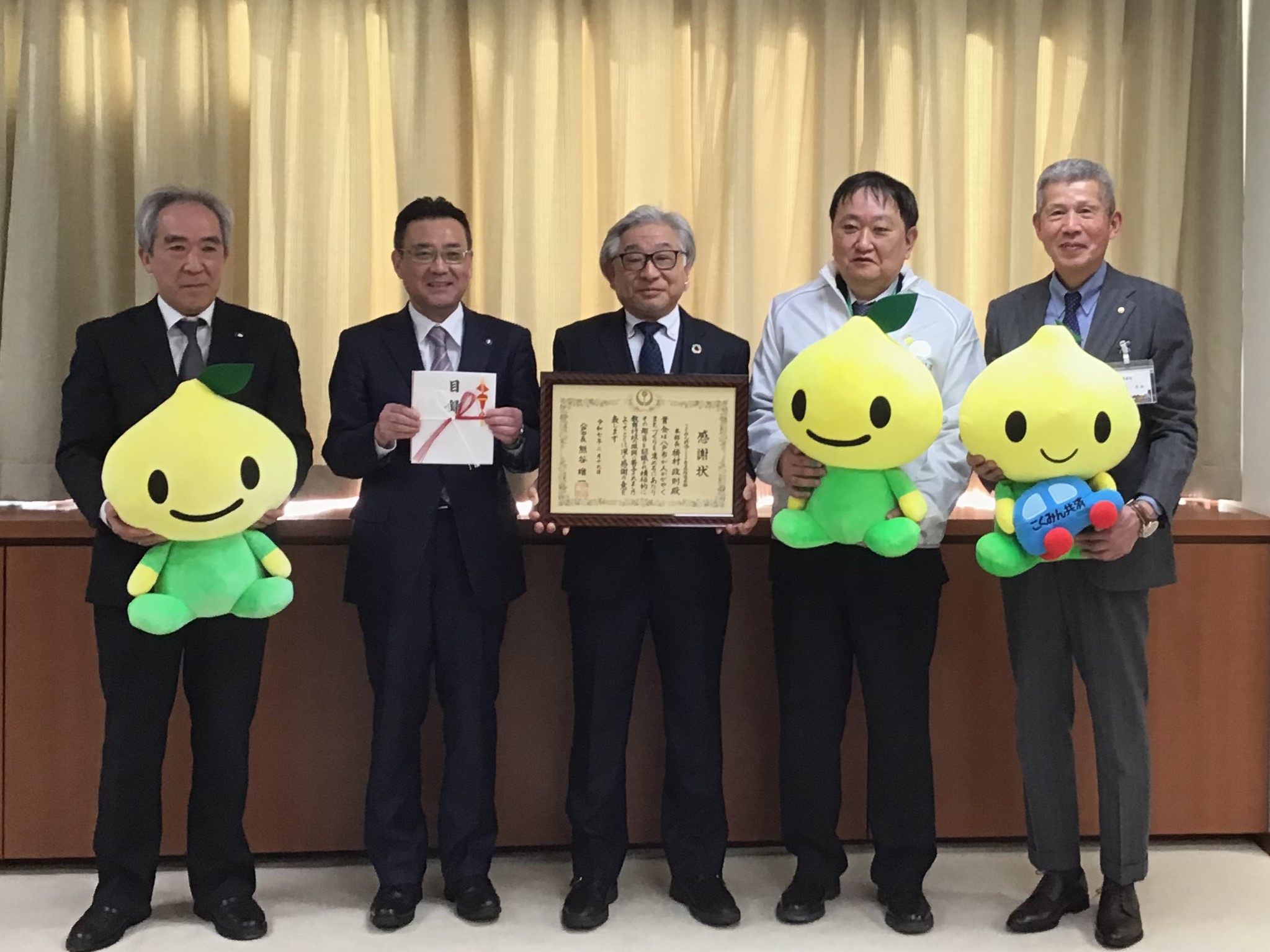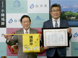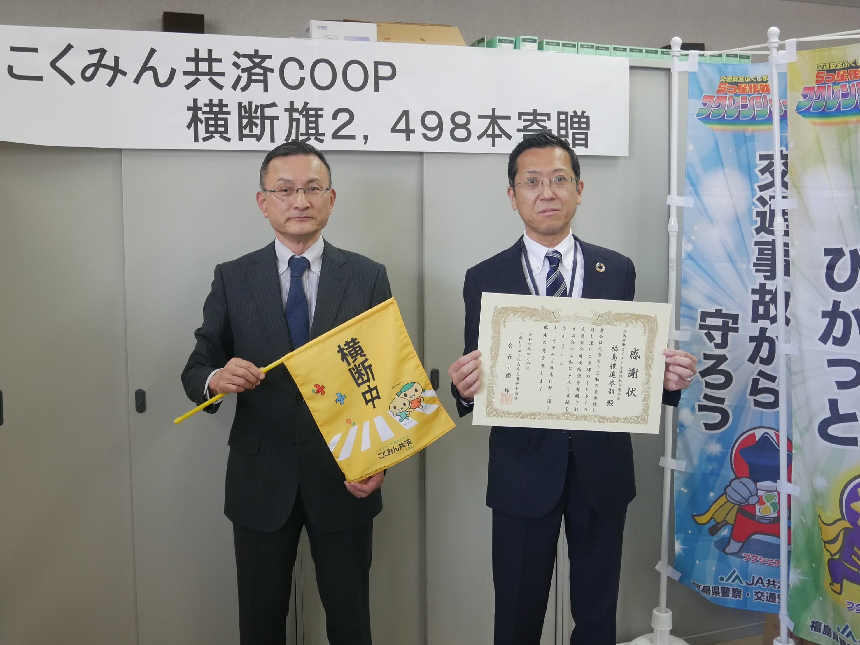 福島推進本部より、福島市交通対策協議会に650本の横断旗を寄贈し、感謝状をいただきました。横断旗は市内の交差点など交通安全指導が必要な場所に設置される予定です。