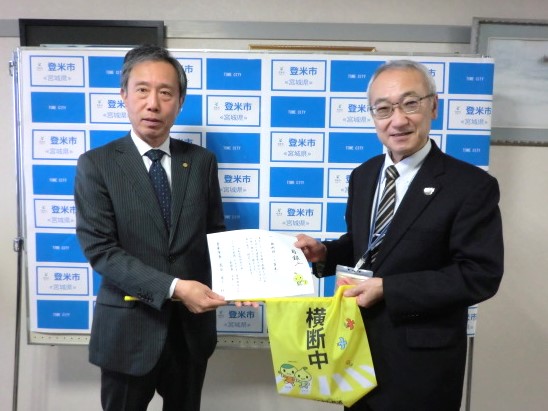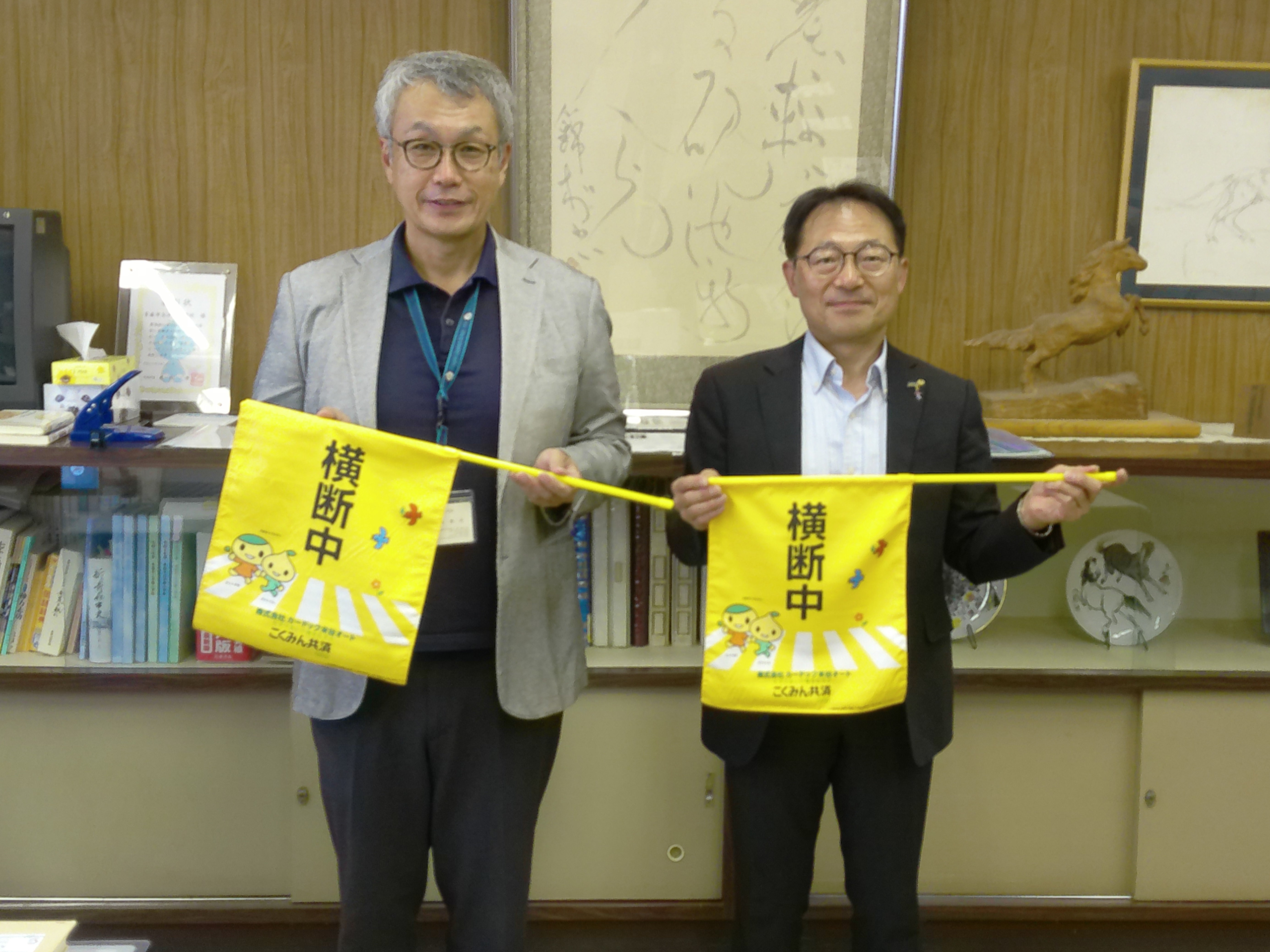 八戸市へ横断旗50本を寄贈しました。寄贈した横断旗は、希望された市内の小学校へ配布され、PTA活動の一環で登下校時の見守り活動に活用いただきます。