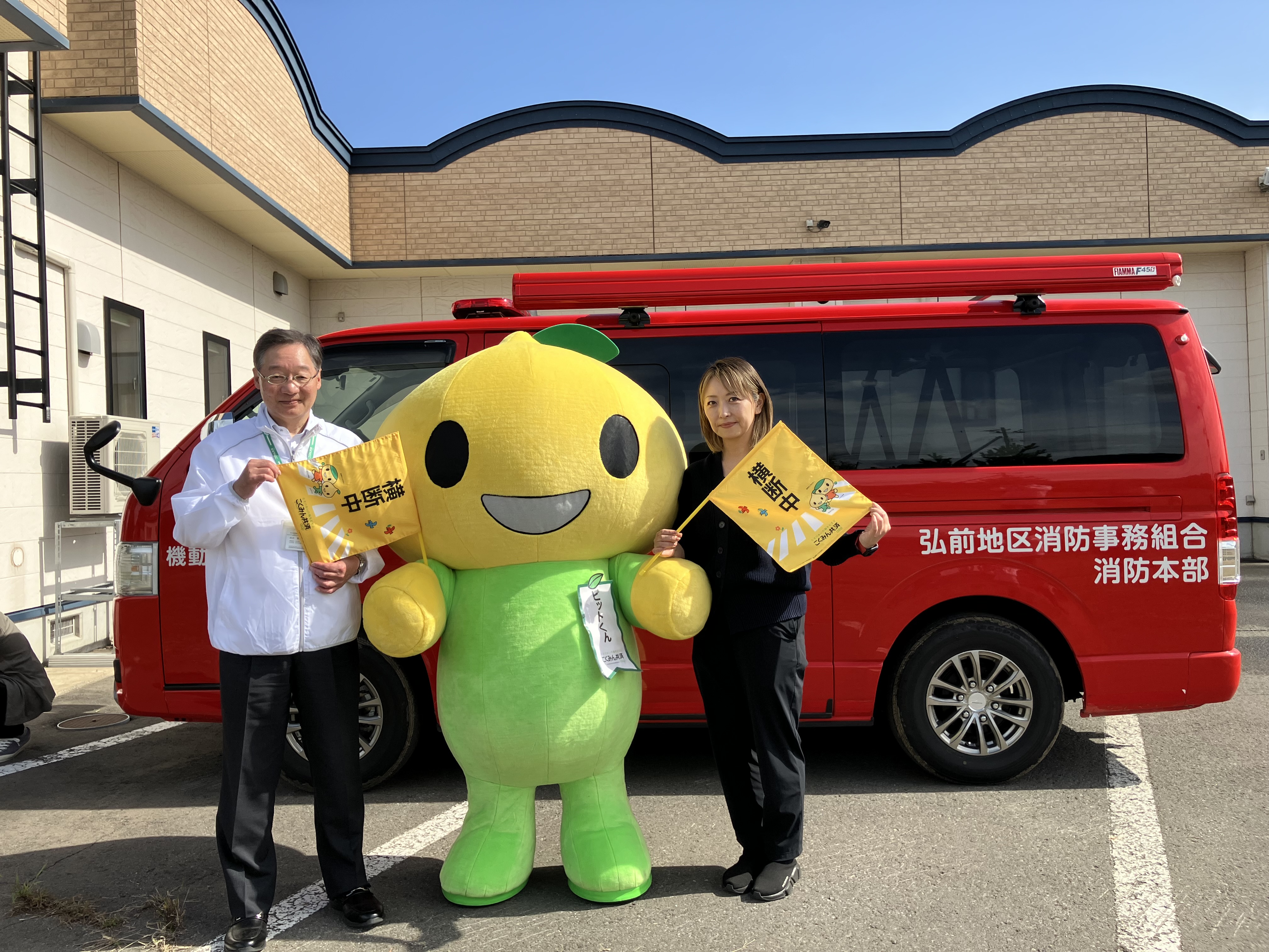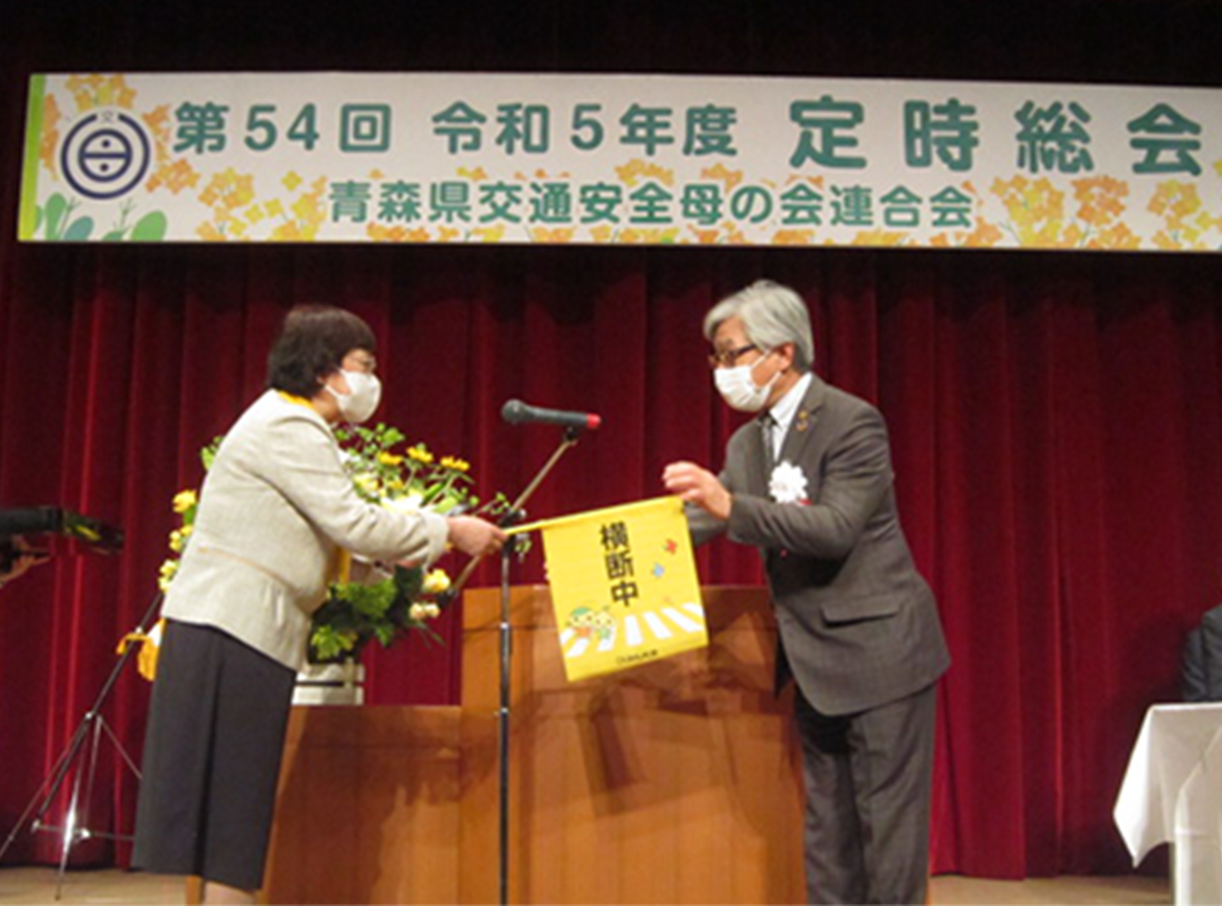青森県交通安全母の会連合会の定時総会にて、横断旗1,551本を寄贈しました。横断旗は県内40市町村の交通安全母の会に提供され、各地域での登下校時の交通安全指導や小学校で活用いただいており、「かわいい」と好評をいただいています。