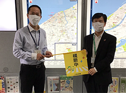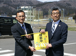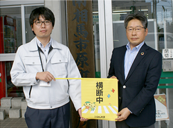 南相馬市役所生活環境課生活安全係へ300本の横断旗を寄贈しました。今後は小学校を中心に横断旗を配布いただき、横断歩道での交通安全に活用いただく予定です。