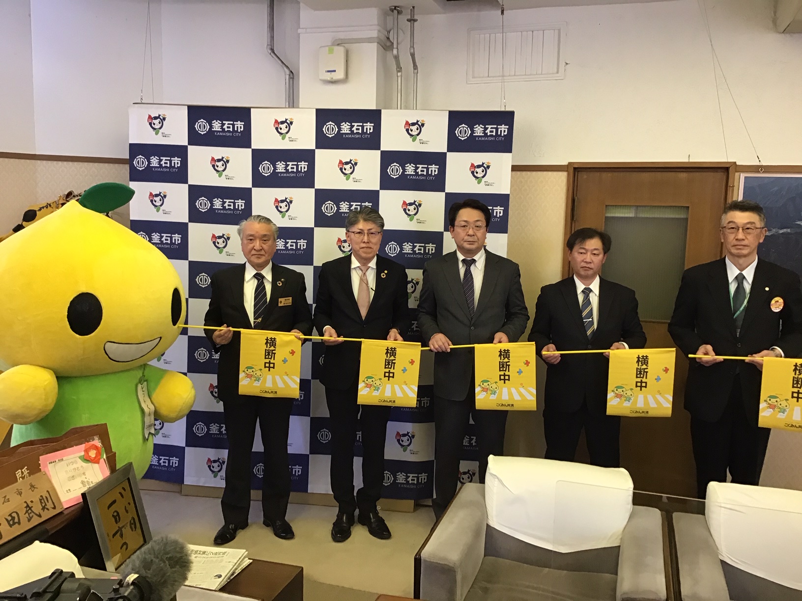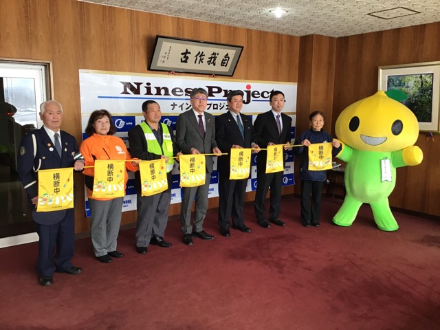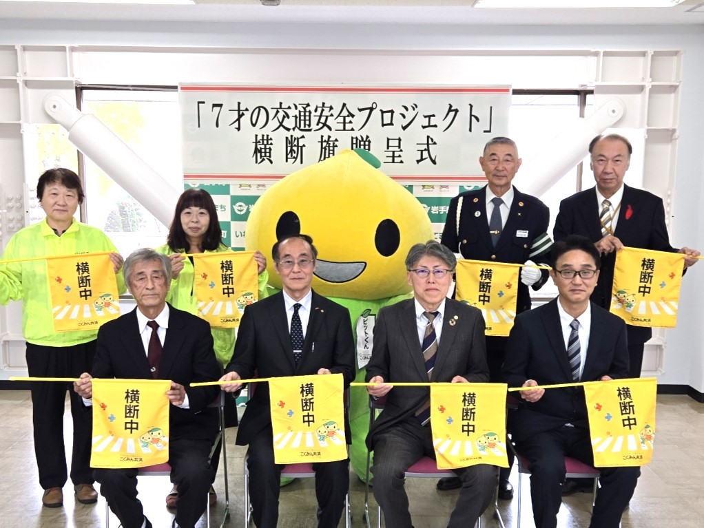 交通安全関係団体、岩手推進本部代表委員の皆さまに参加いただき横断旗を贈呈することができました。寄贈式当日はピットくんが大人気で、皆さんから感謝のお言葉をいただきました。