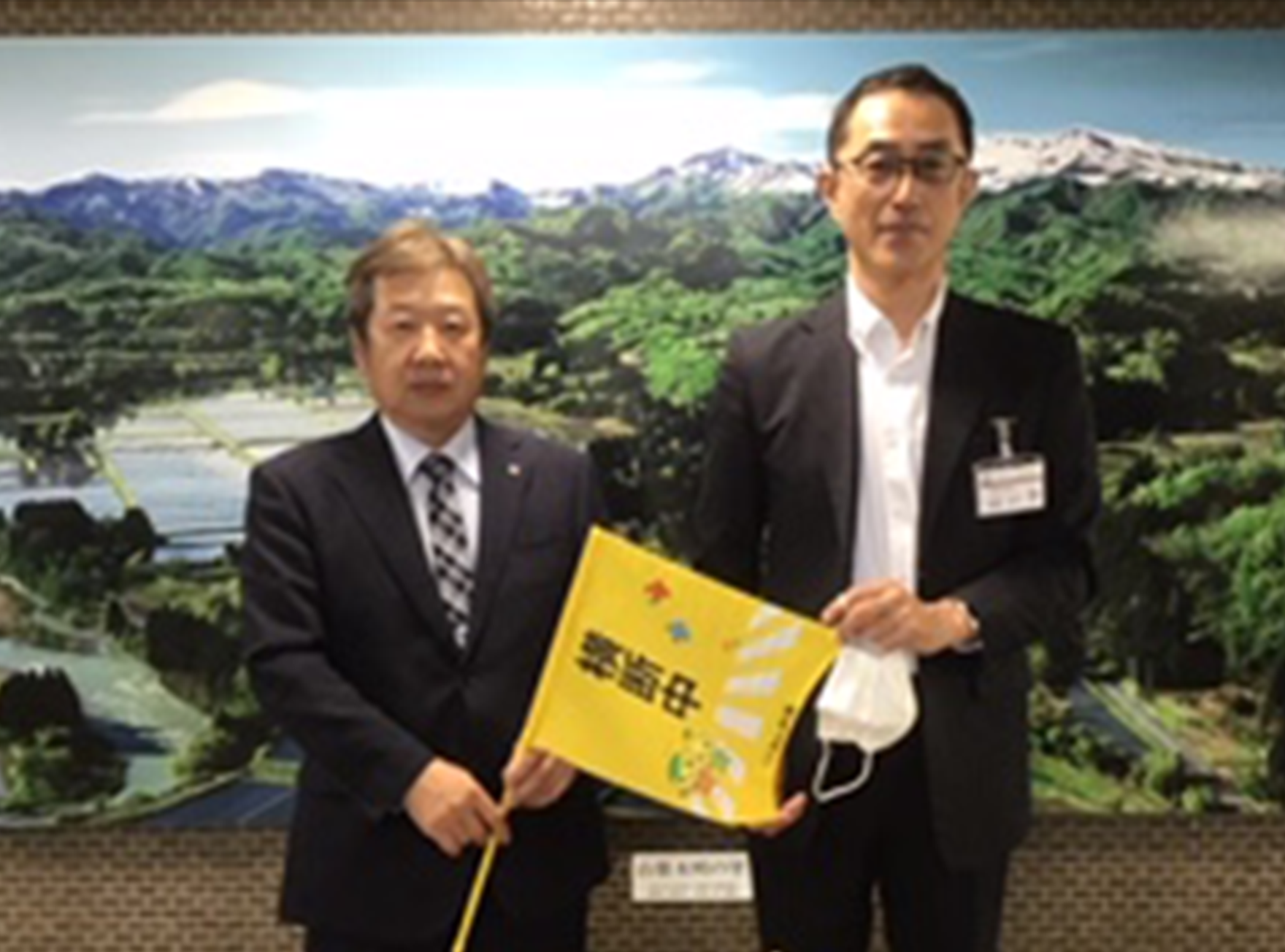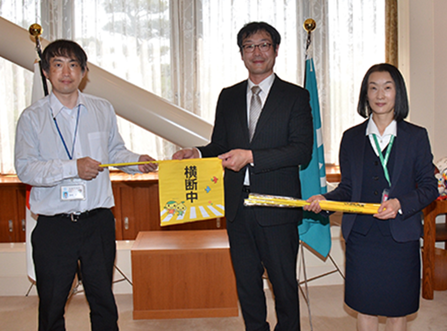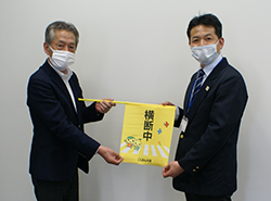 公益財団法人新潟県交通安全協会と、新潟県県民生活課交通安全対策室の2団体に、横断旗を寄贈しました。今後、県内の子どもたちの登下校を見守るために活用される予定です。