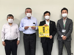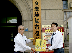 会津若松市役所危機管理課交通防犯グループへ100本の横断旗を寄贈しました。横断旗は、横断歩道のある交差点の信号機等に設置し、子どもたちの交通安全に役立てていただきます。