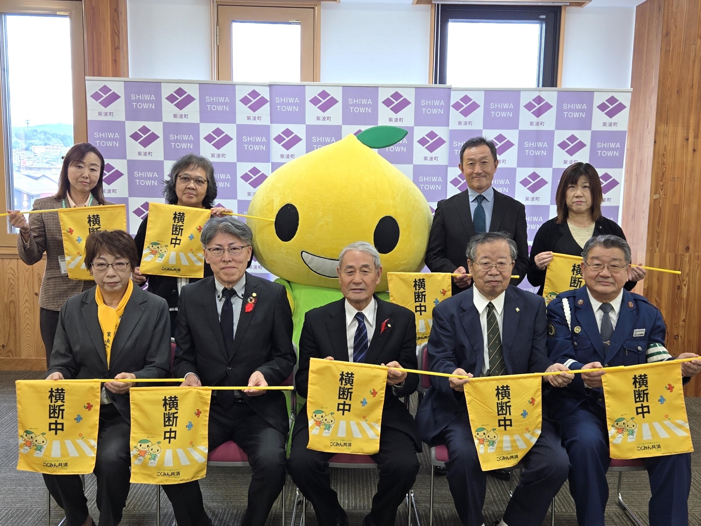 岩手町へ横断旗300本を寄贈しました。寄贈した横断旗は、町内交通安全関係団体、学校等に配布され、子どもや高齢者、住民の事故防止に活用いただきます。