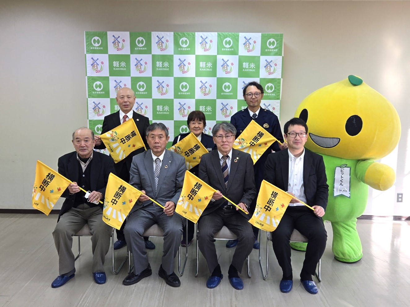 軽米町へ横断旗300本を寄贈しました。寄贈した横断旗は、町内交通安全関係団体、学校等に配布され、子どもや高齢者、住民の事故防止に活用いただきます。