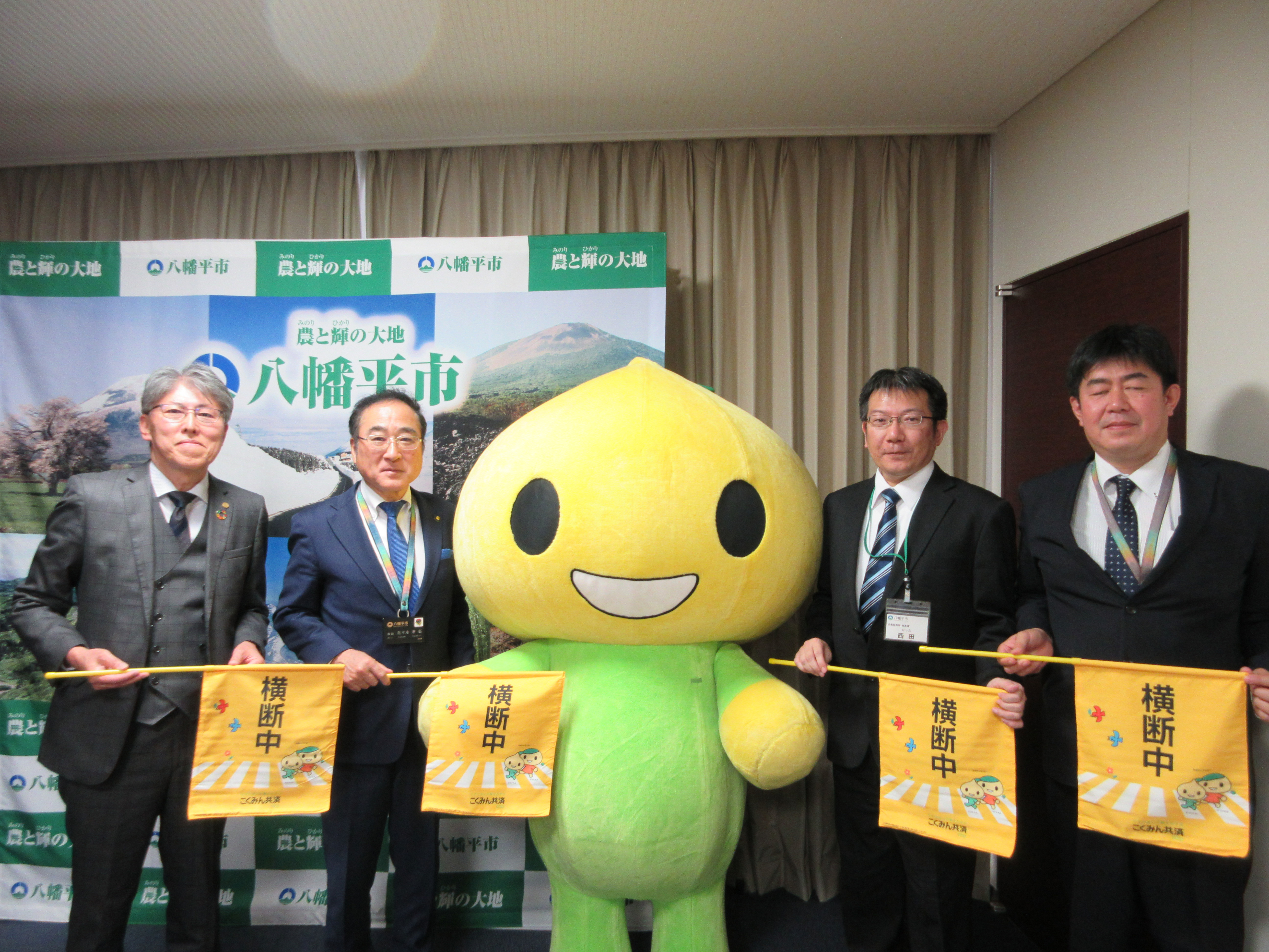 八幡平市への贈呈式には、佐々木市長、交通安全関係団体・地元協力団体代表者等の方々にご出席いただき、横断旗300本を贈呈しました。