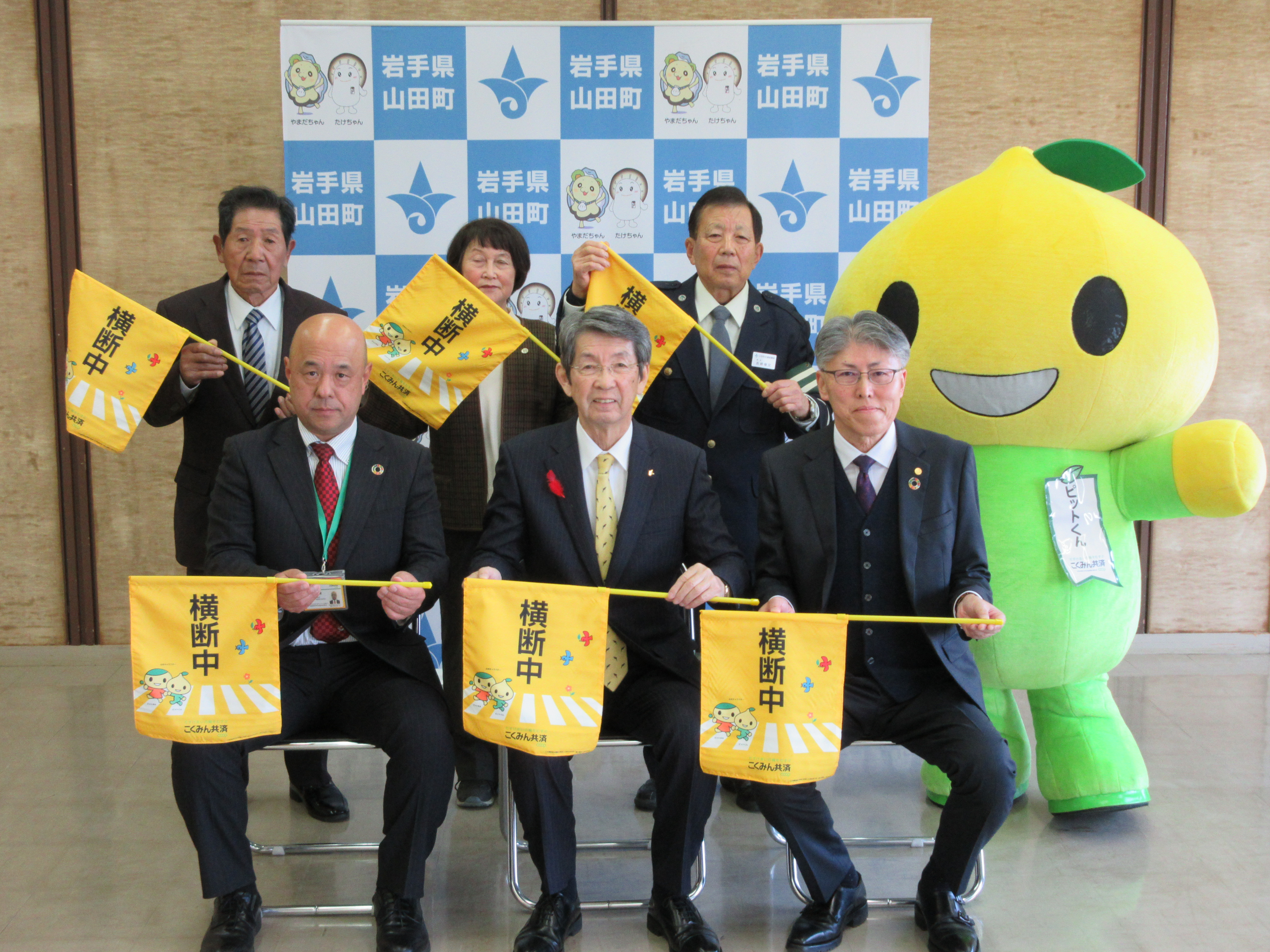 山田町への贈呈式には、佐藤町長、交通安全協会・母の会・交通指導隊の方々の出席をいただき、横断旗300本を贈呈しました。
