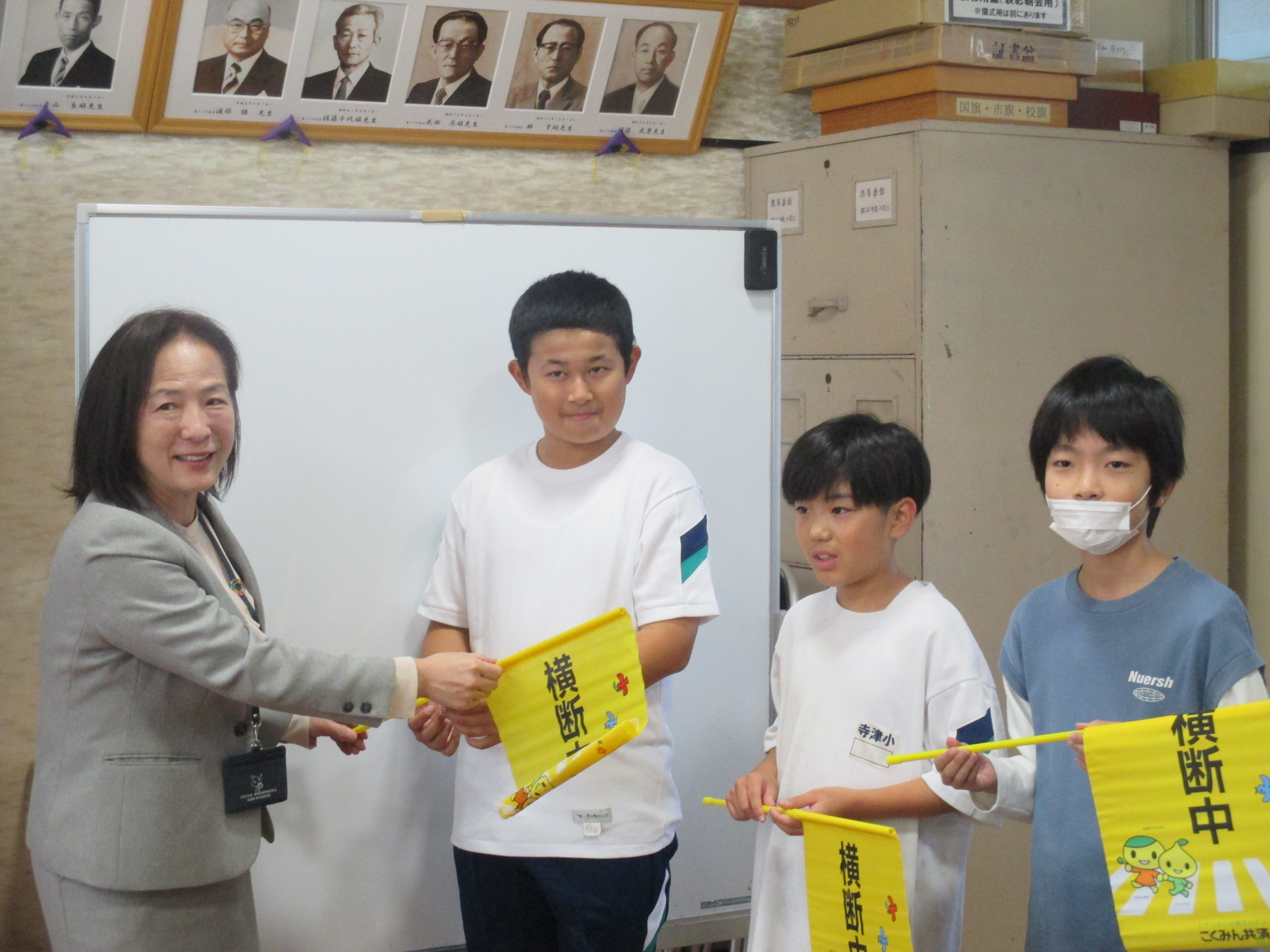 天童市寺津小学校へ横断旗10本を寄贈しました。寄贈した横断旗は、子どもたちへの交通安全の取り組みや近隣の横断歩道で活用いただきます。