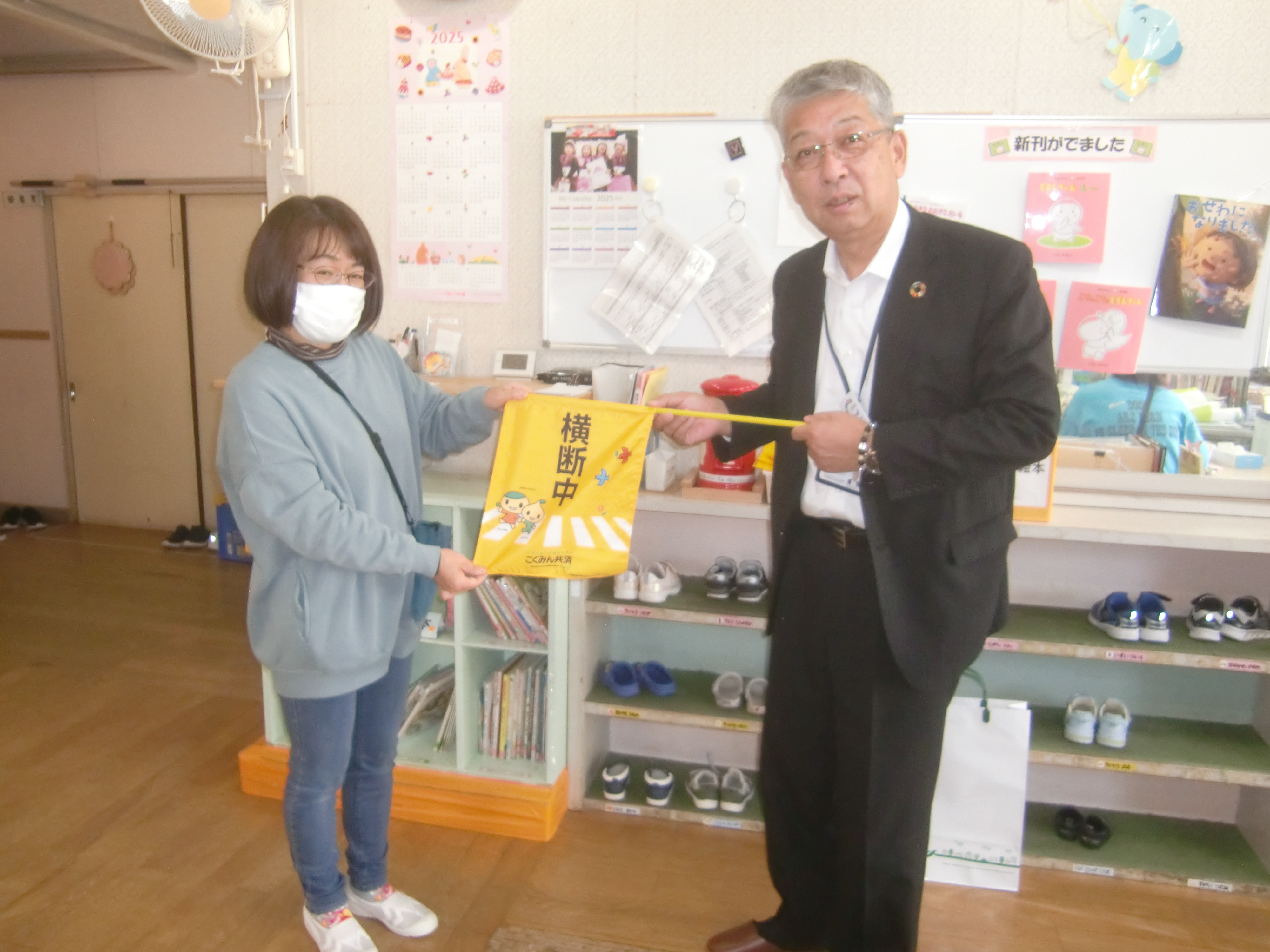 鶴岡市立かたばみ保育園へ横断旗10本を寄贈しました。