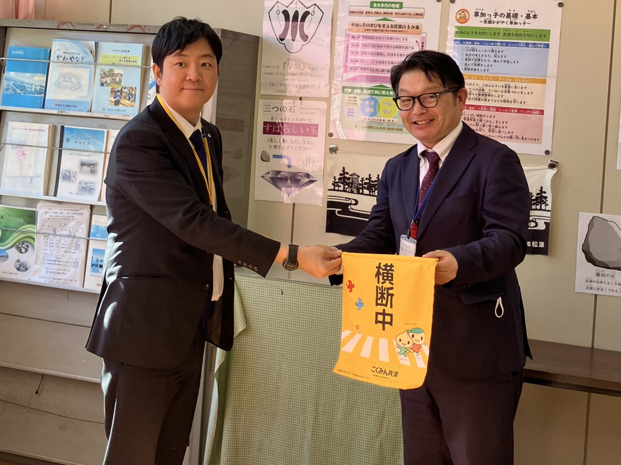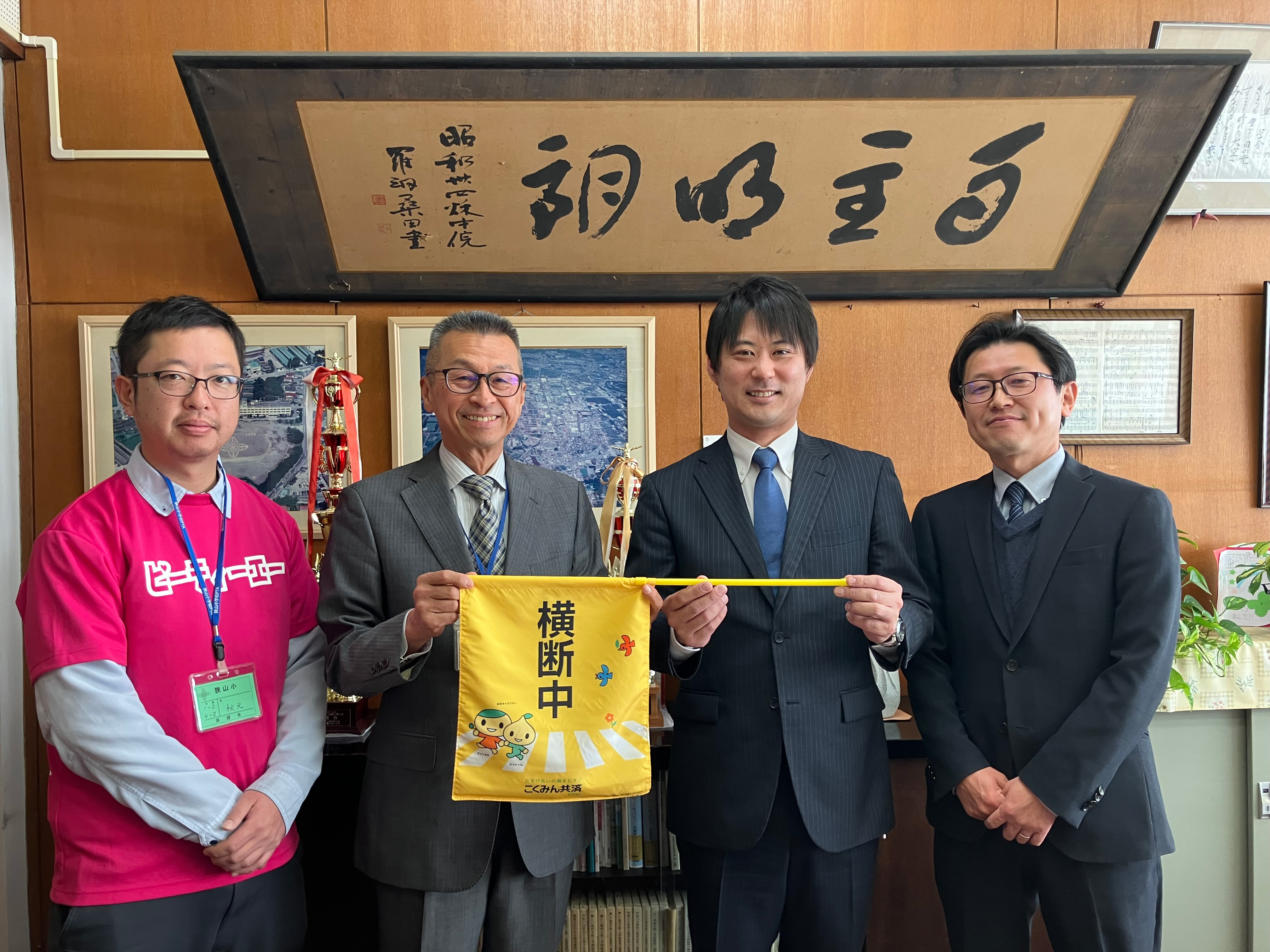 歴史のある学校で、近隣住民の協力も厚い地域ということもあり、保護者の皆さまと連携しながら横断旗を活用していきたいとのお話をいただきました。また、こくみん共済 coop の社会貢献活動に関心を寄せていただき、大変ありがたく思っています。