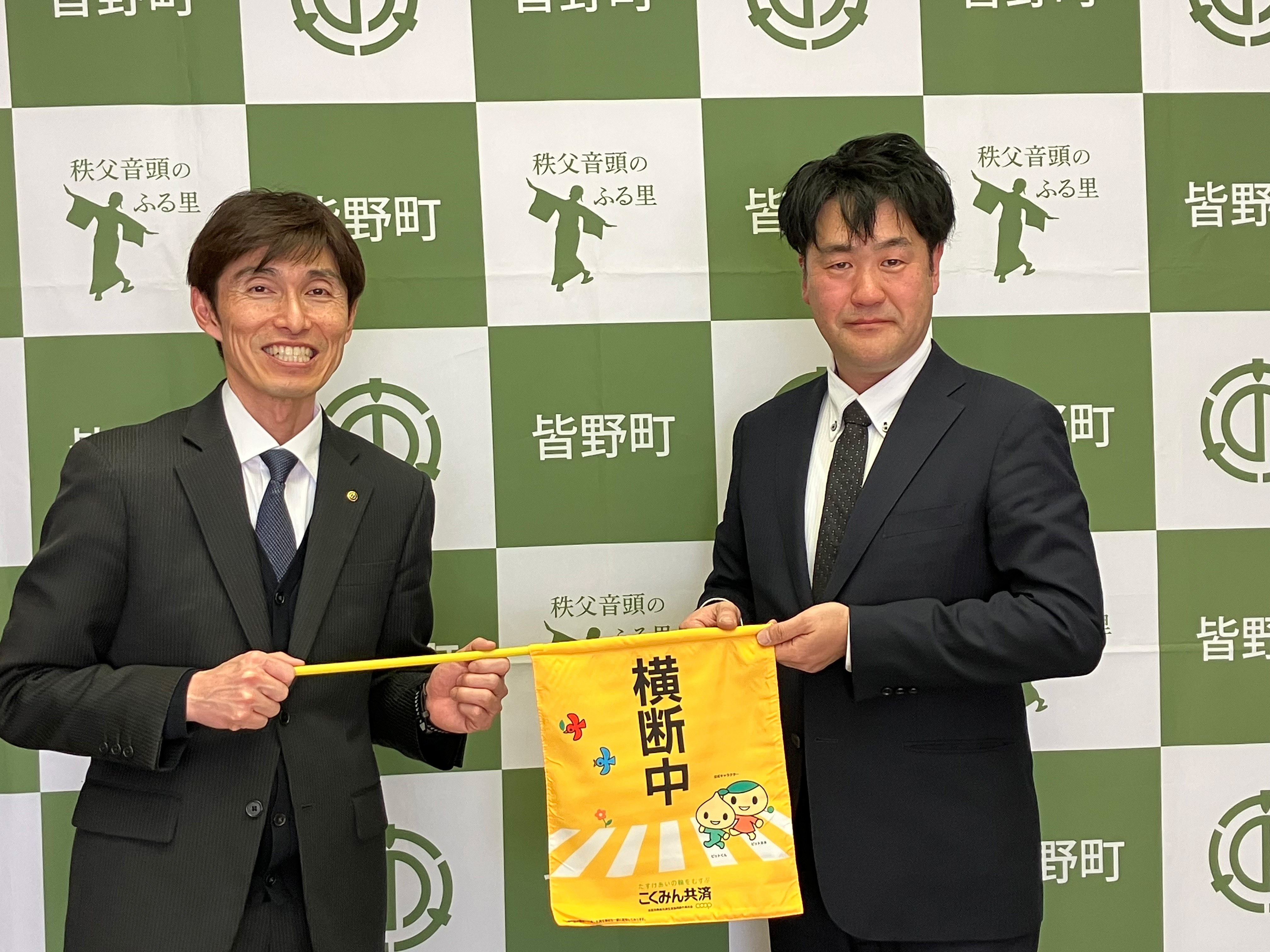 塩谷町役場へ横断旗300本を寄贈しました。寄贈した横断旗は、塩谷町の小学校に配布され、小学生の登下校時に活用いただきます。