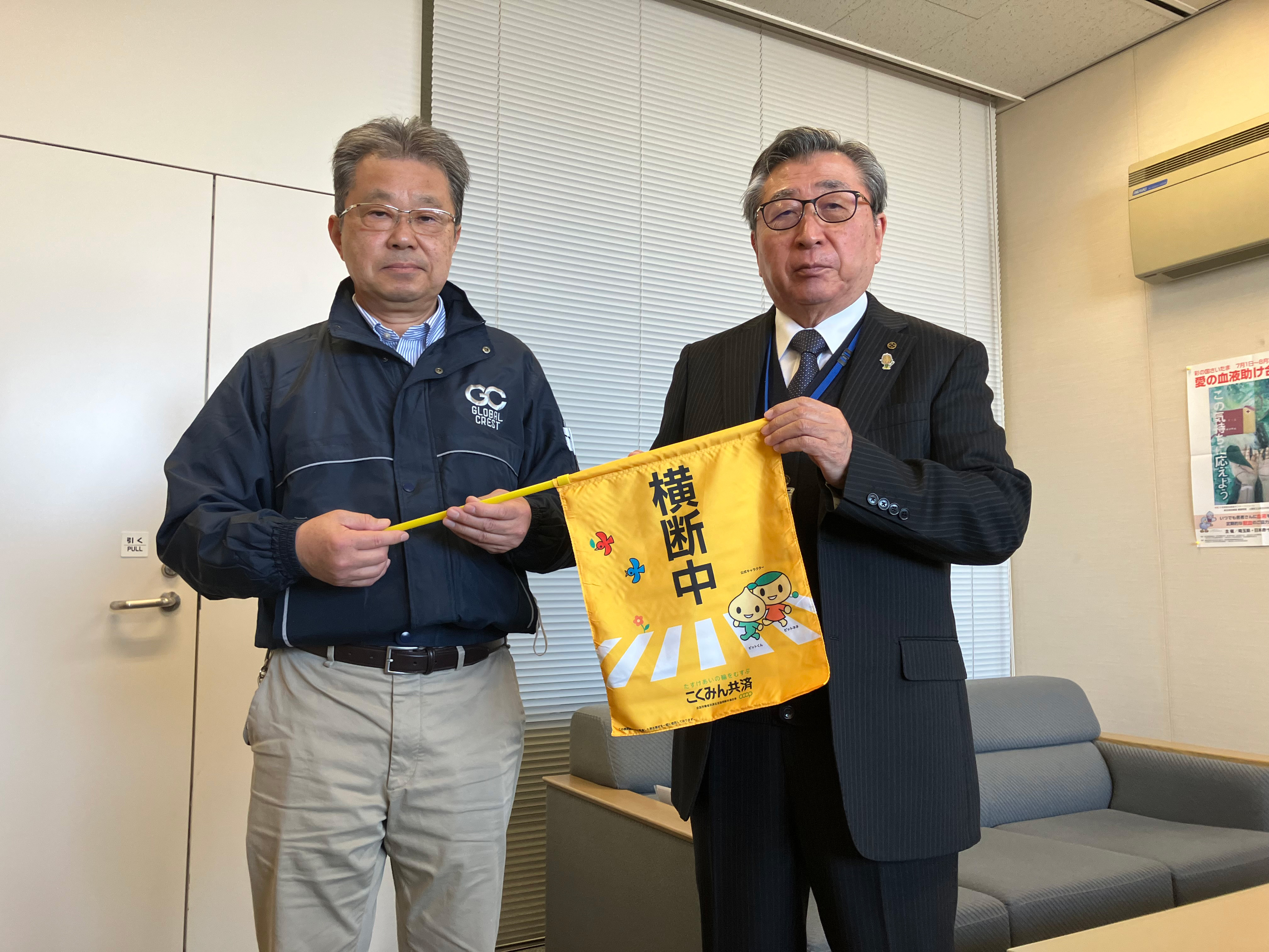 5年前から寄贈を行っており、「7才の交通安全プロジェクト」に対して高い関心をいただいています。現在も子どもたちが横断旗を使用しており、横断旗の存在が運転者への安全運転の意識づけにもつながっていると感じています。また、設置型の横断旗は雨風で劣化しやすく、交換頻度も高いため、今後も活動を継続してほしいとのお言葉をいただきました。引き続き協力団体との取り組みを強化し、多くの寄贈につなげていきたいと思います。