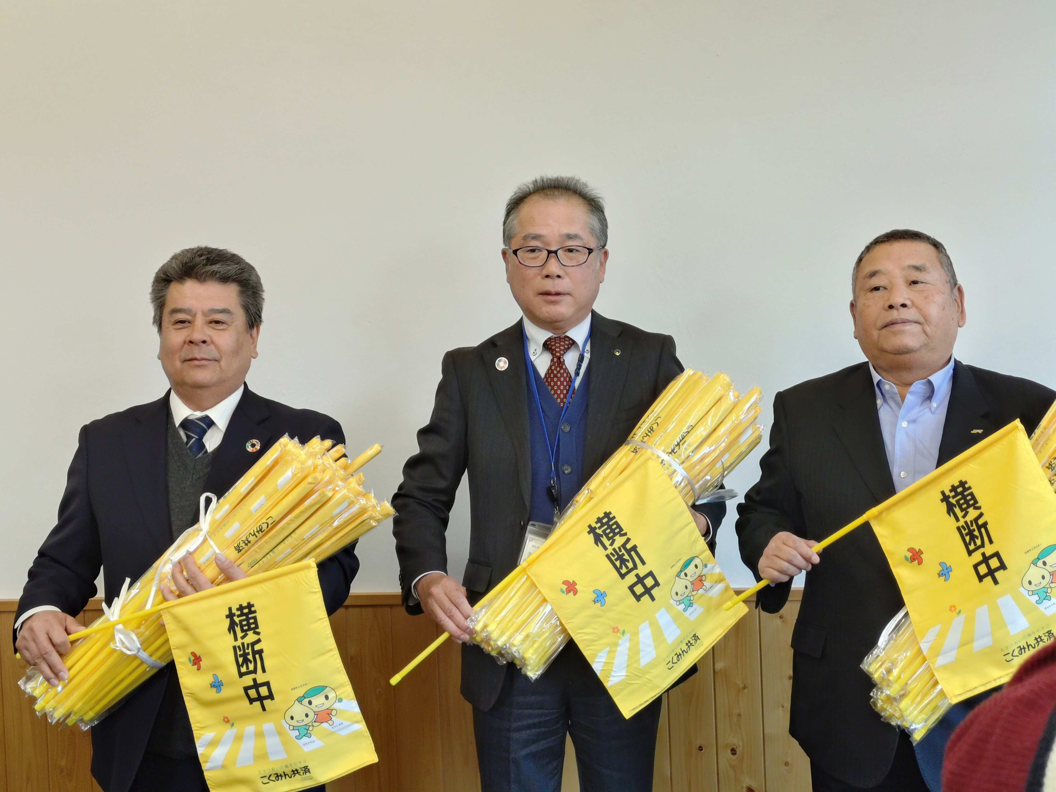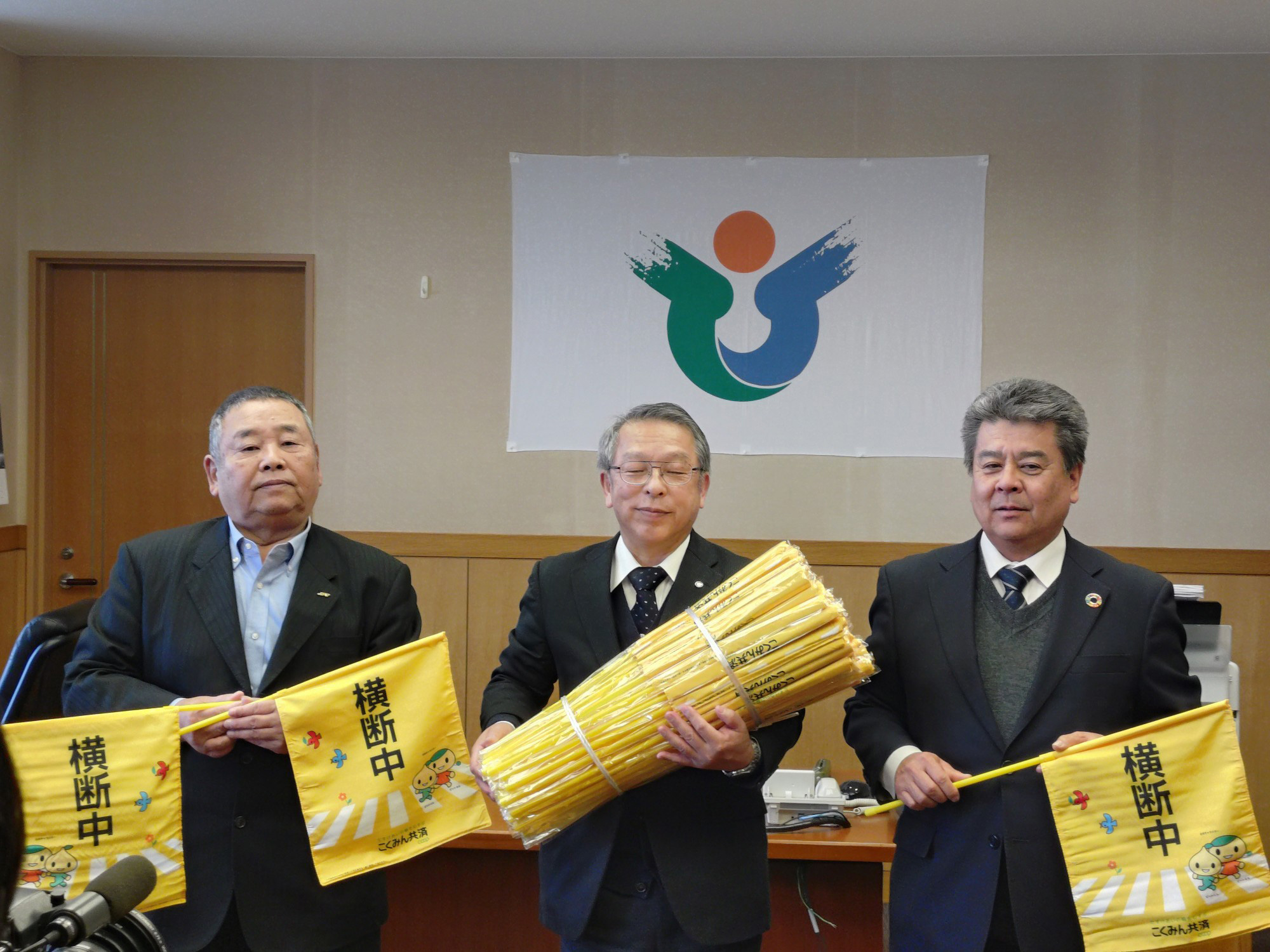 長崎推進本部と自治労共済推進本部長崎県支部より、長崎県内23地区の交通安全協会に合計3,417本の横断旗を寄贈しました。横断旗は県下の各小学校区の通学路で活用いただく予定です。