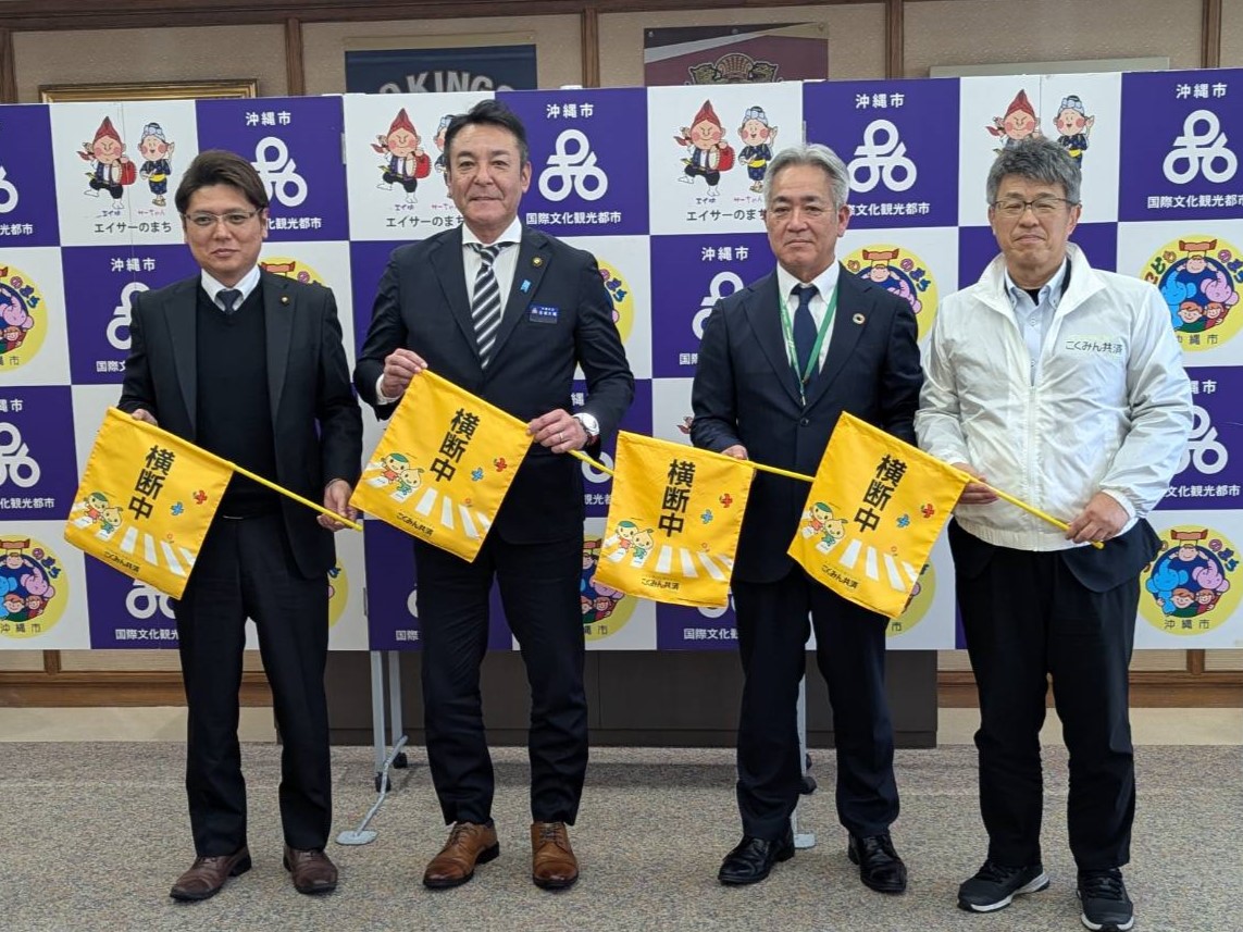 沖縄市へ横断旗1,000本を寄贈しました。寄贈した横断旗は、市内の小学校・幼稚園・保育園などで活用いただきます。