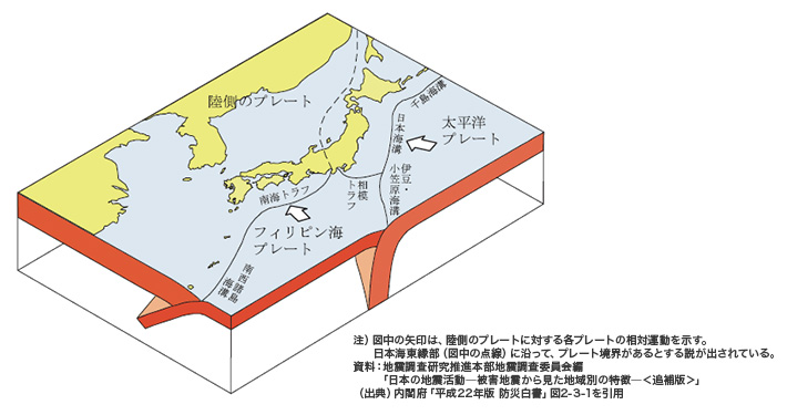 地震は、地表を覆う「プレート」と呼ばれる岩盤が動くことで発生します。日本の周りには複数のプレートがあり、それぞれがぶつかったり、すれ違ったり、下に沈み込んだりして、大きな地震が引き起こされています。