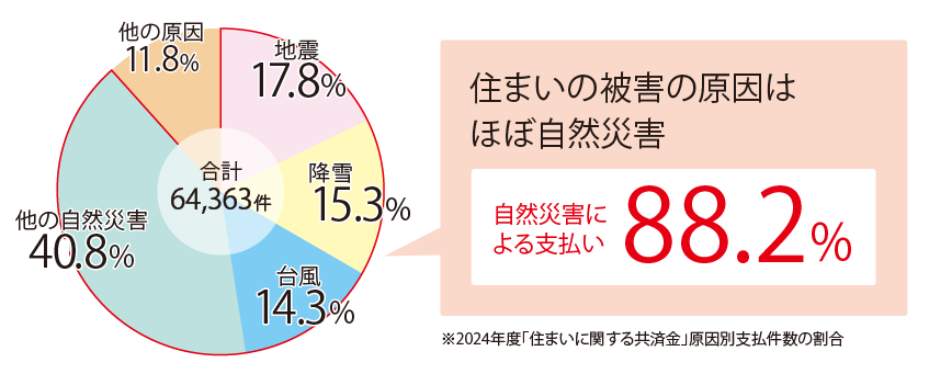 じつは、一般的な住まいの保障の場合、通常、自然災害による被害は給付金の支払い対象になりません。そのため、自然災害に対する備えもしっかりしておきたいところです。