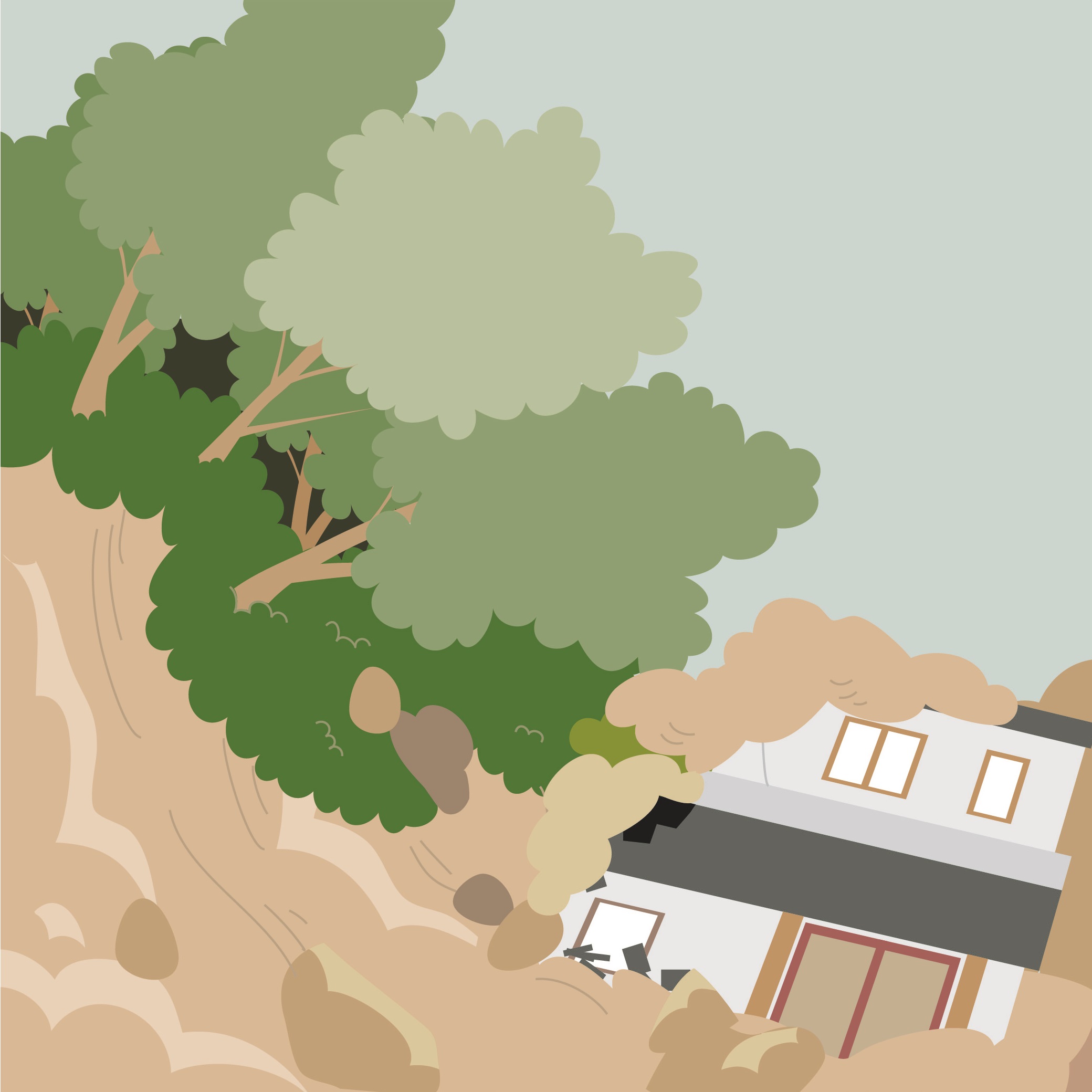 強い風が吹き続けると、看板が飛んだり、木や電柱、建物が倒れてしまうことも。また、雨がたくさん降って地面がやわらかくなると、がけ崩れや地すべりが起こりやすくなるので注意しましょう。