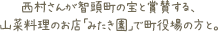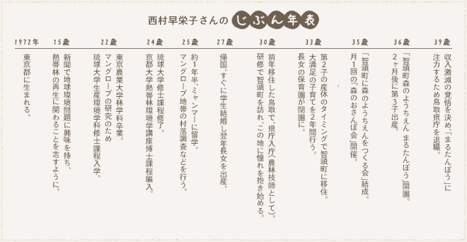 - にしむら・さえこ/東京都出身。中学時代に新聞を通して知った地球環境問題への関心から、熱帯林再生に携わりたいと考える。東京農業大学林学科→琉球大学農学研究科生産環境学部(修士課程)→京都大学農学研究科熱帯林環境学講座(博士課程)と進み、ミャンマーへの留学も経験する。帰国後の2000年に学生結婚し、出産。夫の出身地である鳥取県に居を移し、農林技師として鳥取県庁に入庁。智頭町に出会い憧れるようになり、第2子の産休を機に移住。2007年より仲間と森のようちえん ※ を智頭町につくる活動を始め、翌々年に開園。2012年より専従。 智頭町森のようちえん まるたんぼう公式サイト