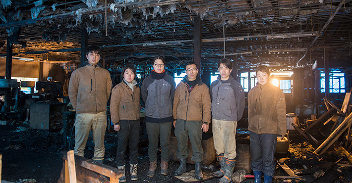 2016年1月23日。私たち「ようび」は間もなく7年目を迎え、スタッフを増やして拡大してゆこうとしていたところでした。冷え込んだ日、まだ夜が明けぬころです。村内放送でどこかの火事の第一報に気づいた私は、地域の消防団のメンバーである夫の大島を、ためらいながら起こしました。仕事でずっと徹夜続きだったので…。その後すぐ、大島の電話が鳴りました。村の、お世話になっている方からでした。大島が「うちですか!?」と、言ったんです。燃えているのはようびの工房…?受け止める間もなく、私も、娘を毛布でぐるぐる巻きにして抱き、取るものも取りあえず家を出ました。大島はひたすら、スタッフの誰かが、残業で工房に残っていなかったかを心配していましたね。すべて燃えてしまいましたが、唯一にして最大の幸いは、人的被害がなかったことでした。