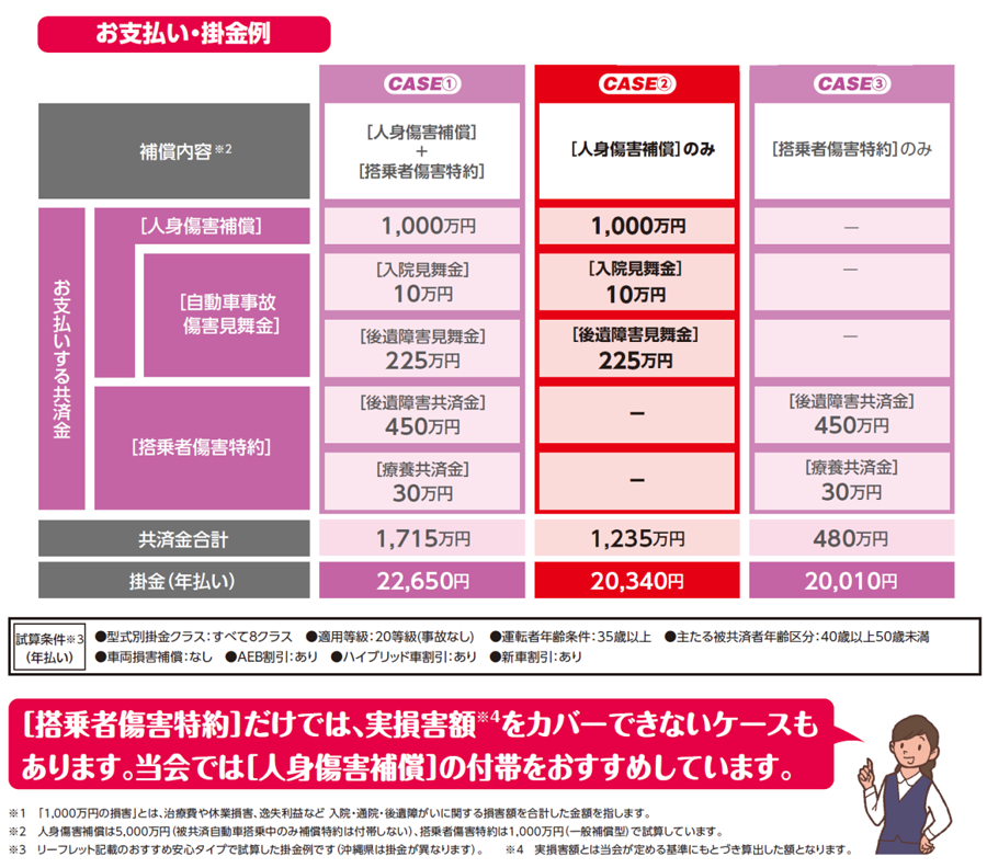 人身傷害補償のみの場合は人身傷害補償として1,000万、入院見舞金10万円、後遺障害見舞金225万円で合計1,235万円となります。また、搭乗者傷害特約では、後遺障害共済金450万円、療養共済金で30万円の合計480万円となりますので、搭乗者傷害特約だけでは損害を補償しきれない計算になるのです。