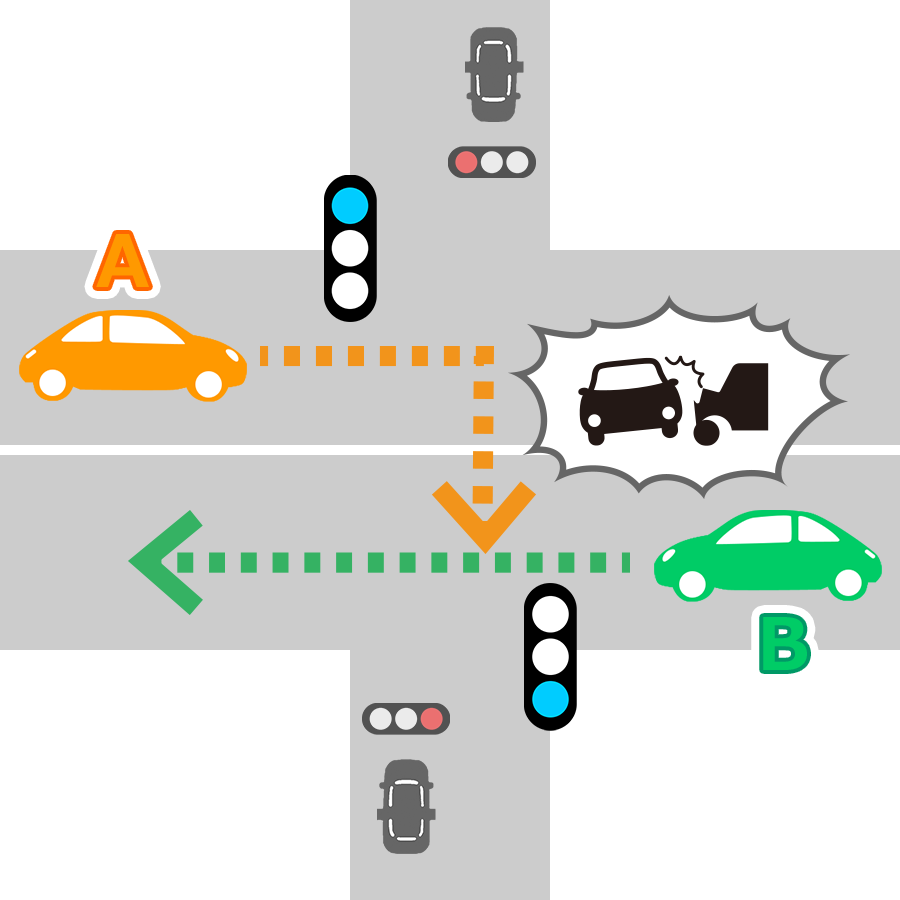 例えば下図のように、Aさんが信号のある交差点を右折時に対向車線のBさんが運転する直進車と衝突した場合、優先は直進車なので右折車(Aさん)にすべての非があると思われる方が多いかもしれません。しかし、実際には直進車(Bさん)の不注意や、スピードの出し過ぎなどによって過失が問われるケースが多いのです。