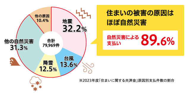 上図のとおり、住まいに関する共済金のお支払いのほとんどは自然災害によるものであることがわかります。