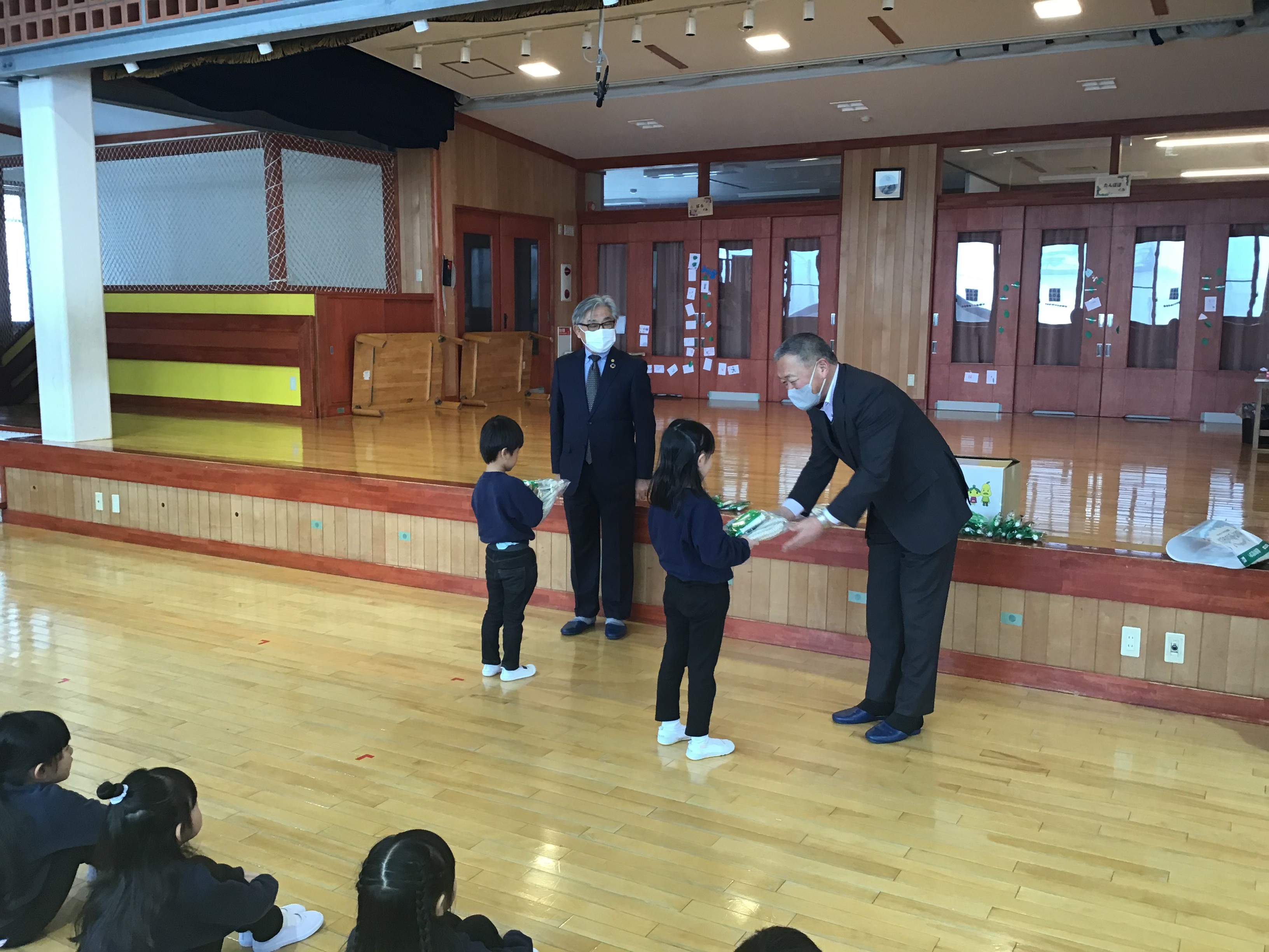 寄贈式では園児一人一人に手渡しでなわとびを配布し、子どもたちはなわとびを見て目を輝かせていました。寄贈式後、楽しそうになわとびや長なわを跳んでいる姿を見て、改めて本プロジェクトは意義のある取り組みであり、子どもたちの笑顔や健全育成につながっているのだと実感しました。
