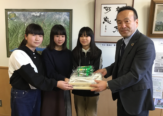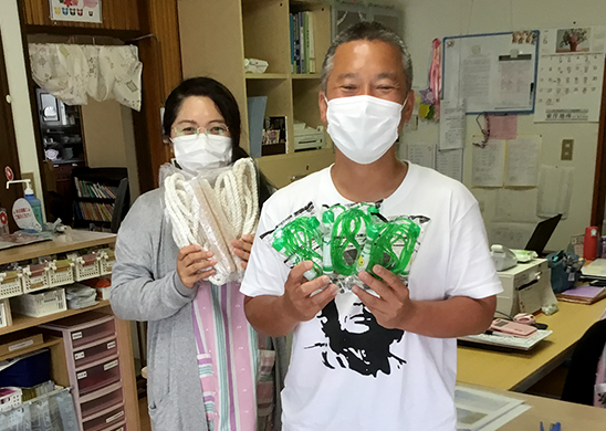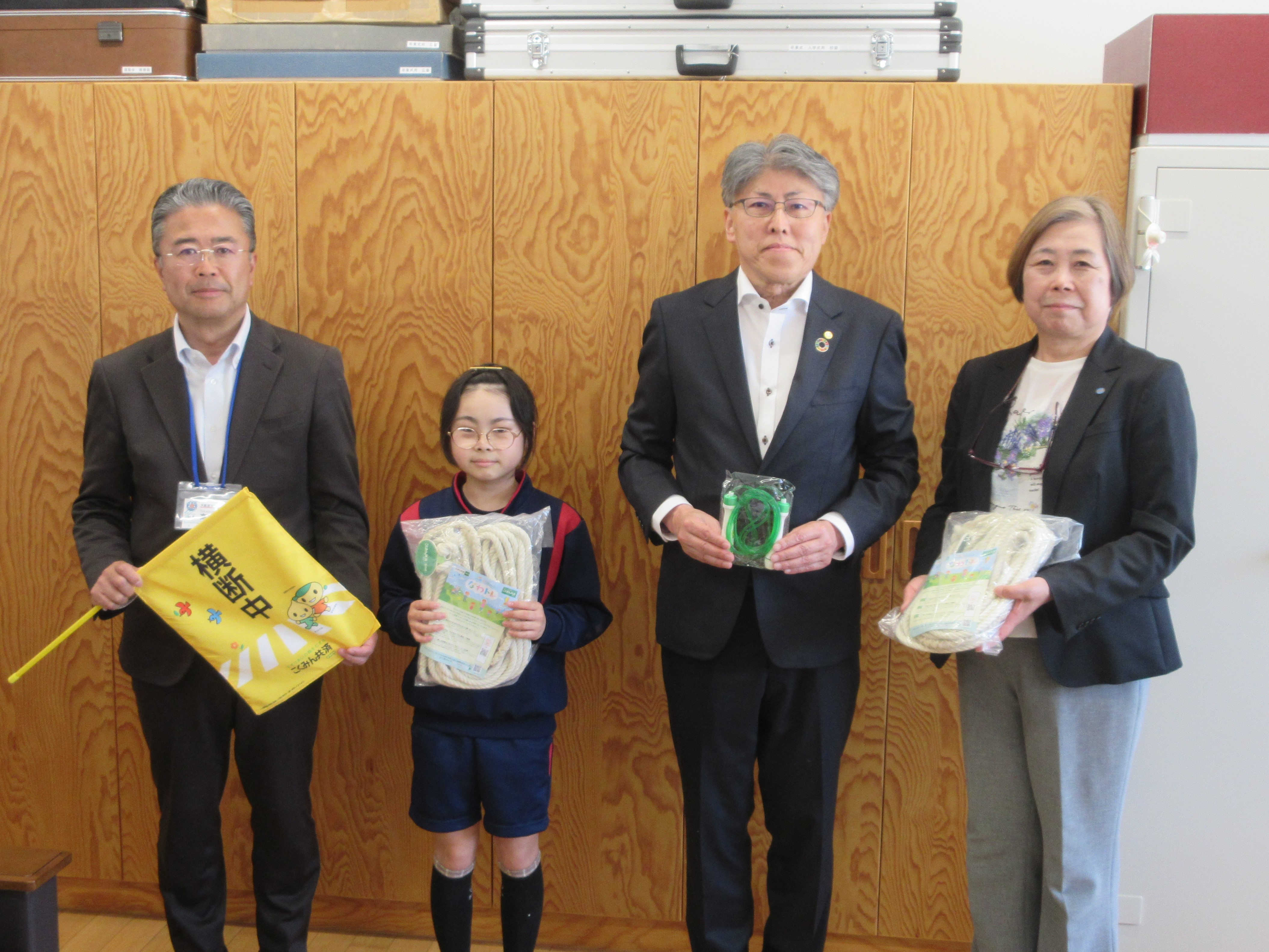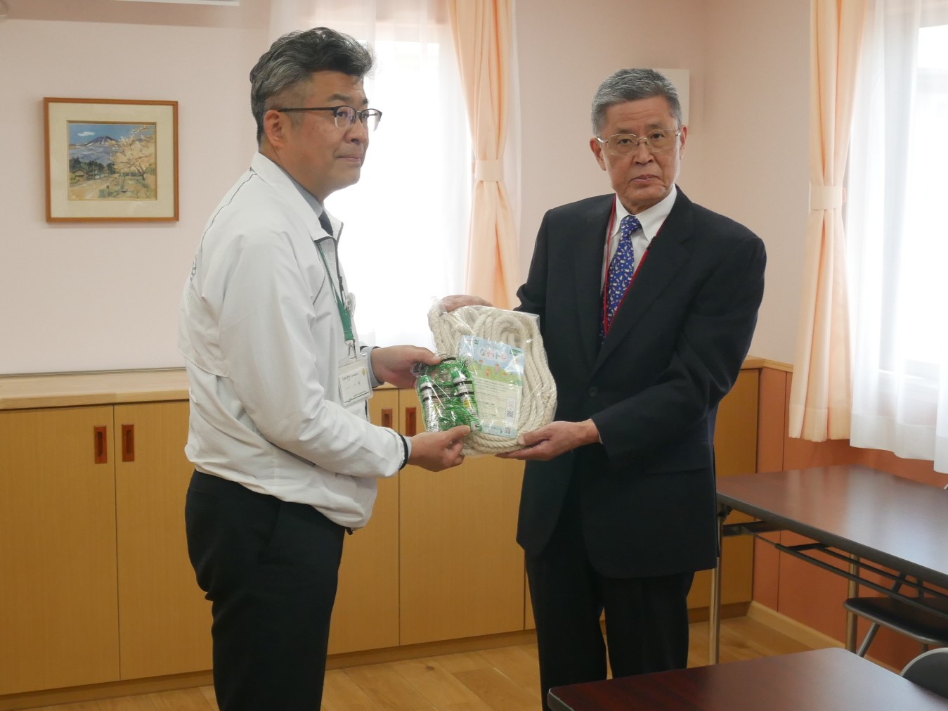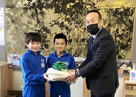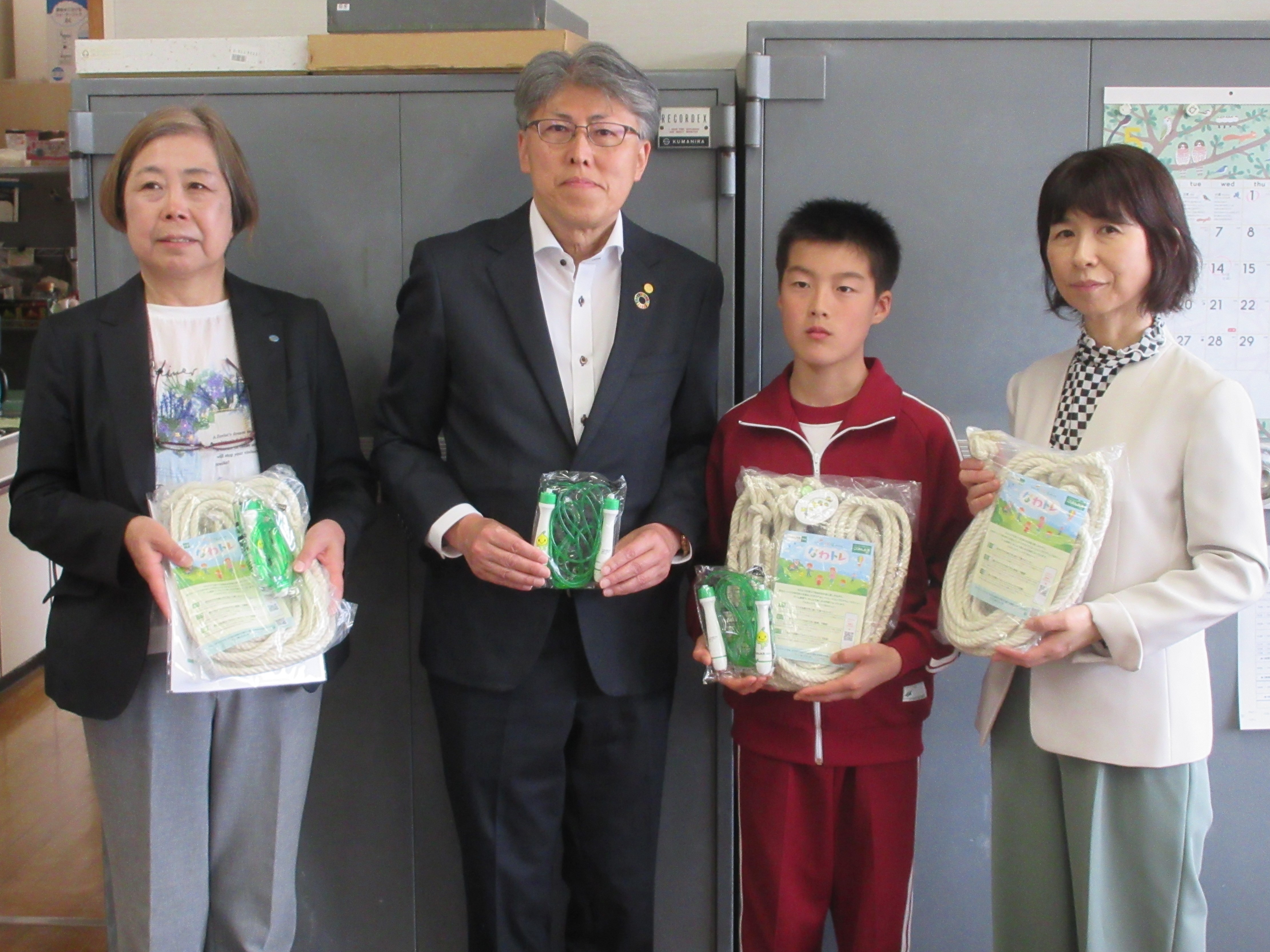 大船渡市立綾里小学校へなわとび50本、長なわ5本を寄贈しました。寄贈したなわとび・長なわは、体育の授業や休み時間の健康増進に活用いただきます。
