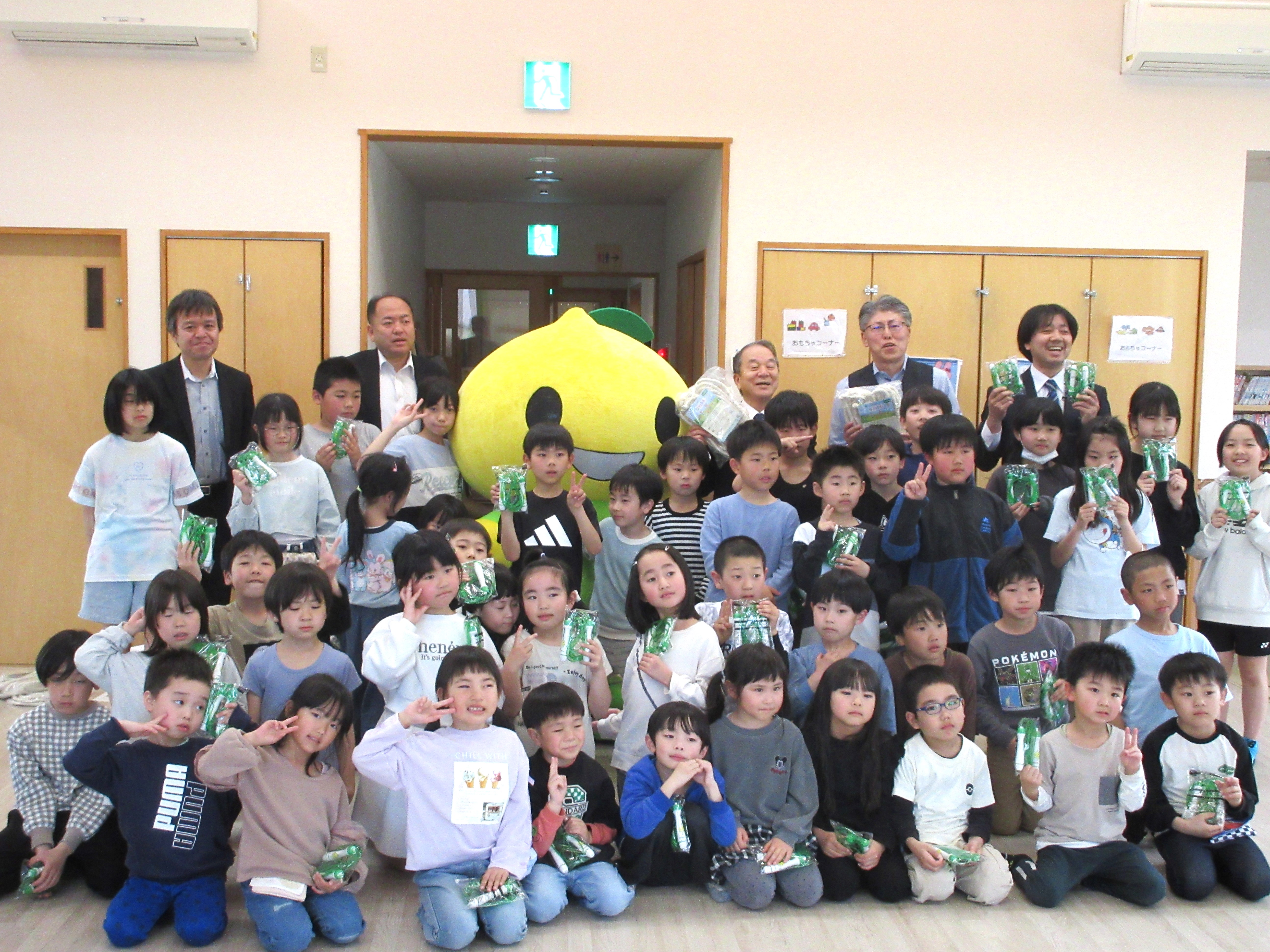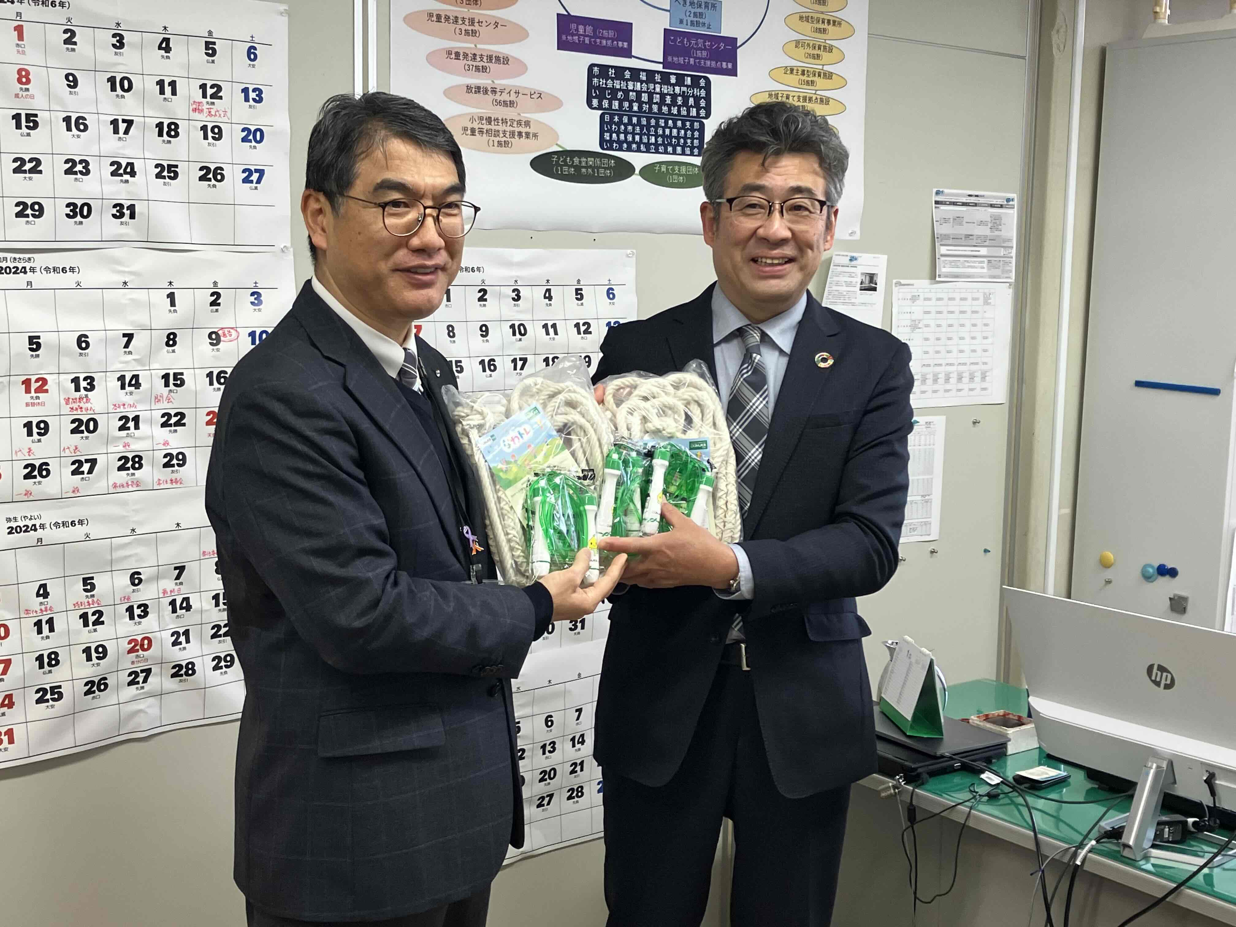 西多賀チェリーこども園へなわとび20本、長なわ10本を寄贈しました。寄贈したなわとび・長なわは、年長クラスの子どもたちに配布し、運動の時間や遊びの時間などに活用いただきます。