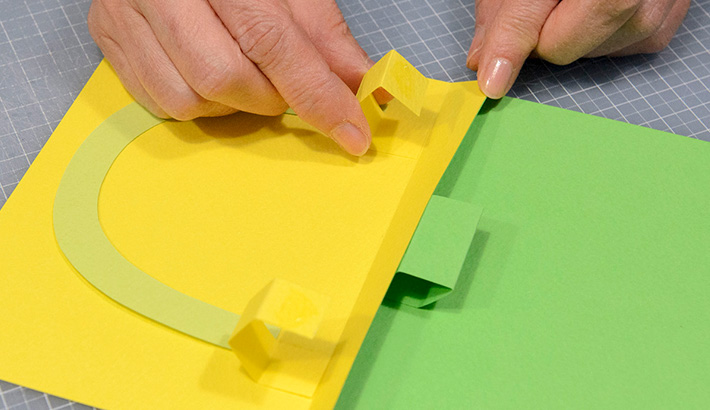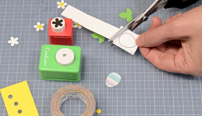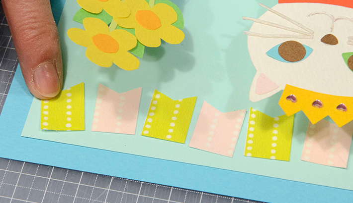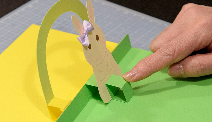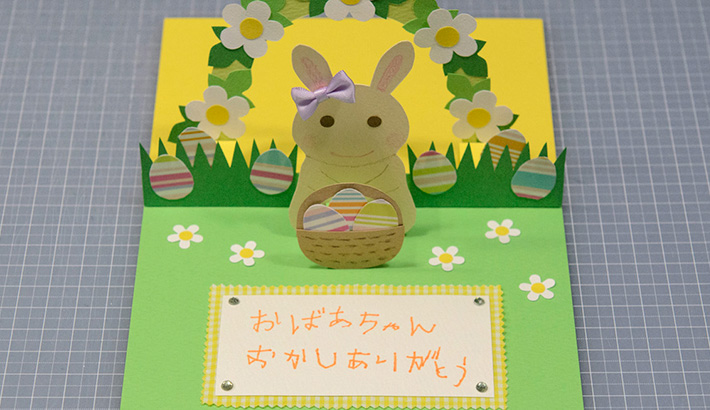 台紙に取り付けた立体パーツに、ウサギとアーチを貼ります。さらにお花や草、イースターエッグなど、春らしい飾り付けをしていきます。