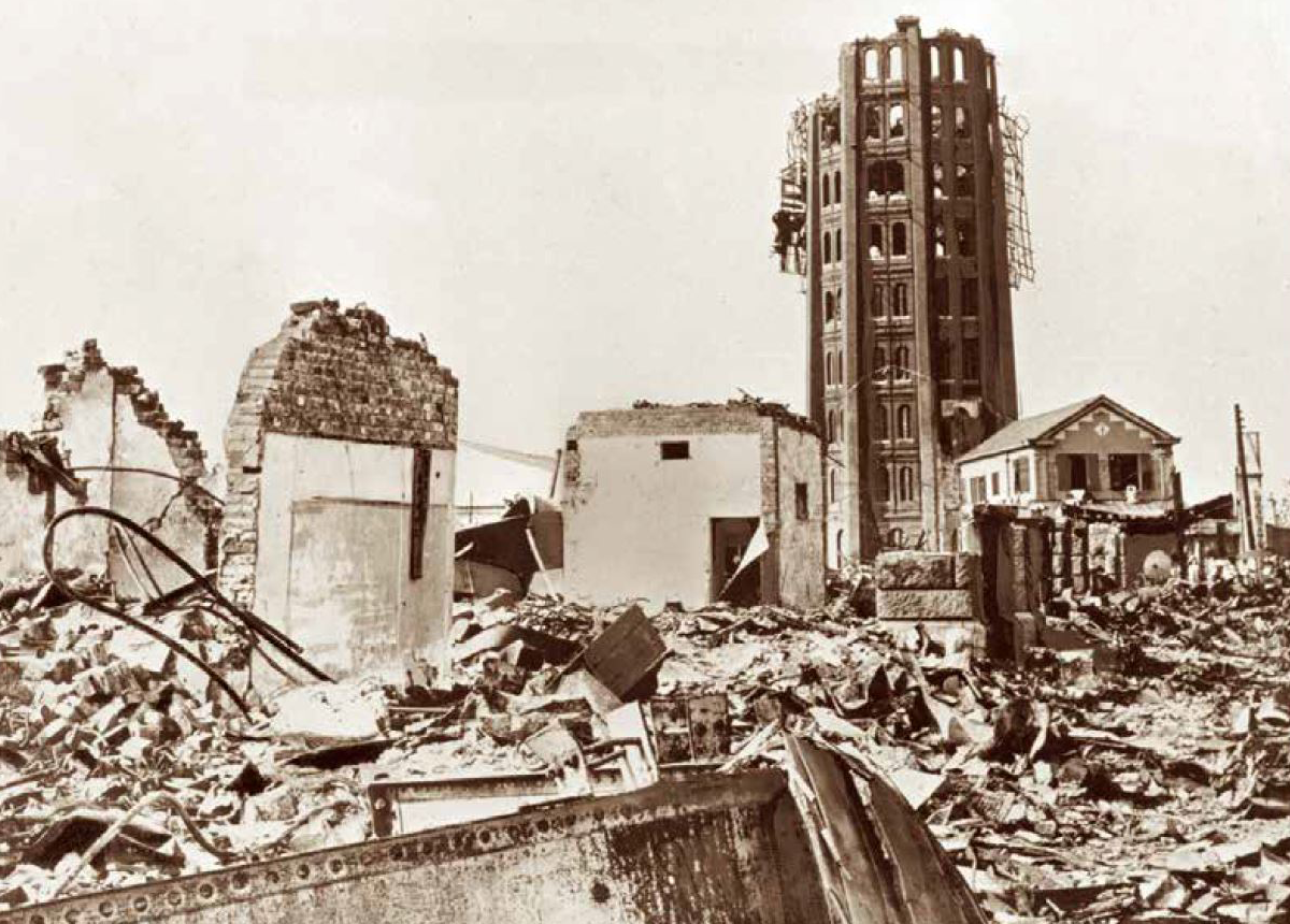 「十二階」とも呼ばれ、当時、東京で最も高かった浅草の凌雲閣(りょううんかく)。50メートル余の高さで、電動エレベーターも備えていたが、揺れで8階より上が崩落した。壁面の一部がぶら下がって残り、危険なため、爆破して解体された。