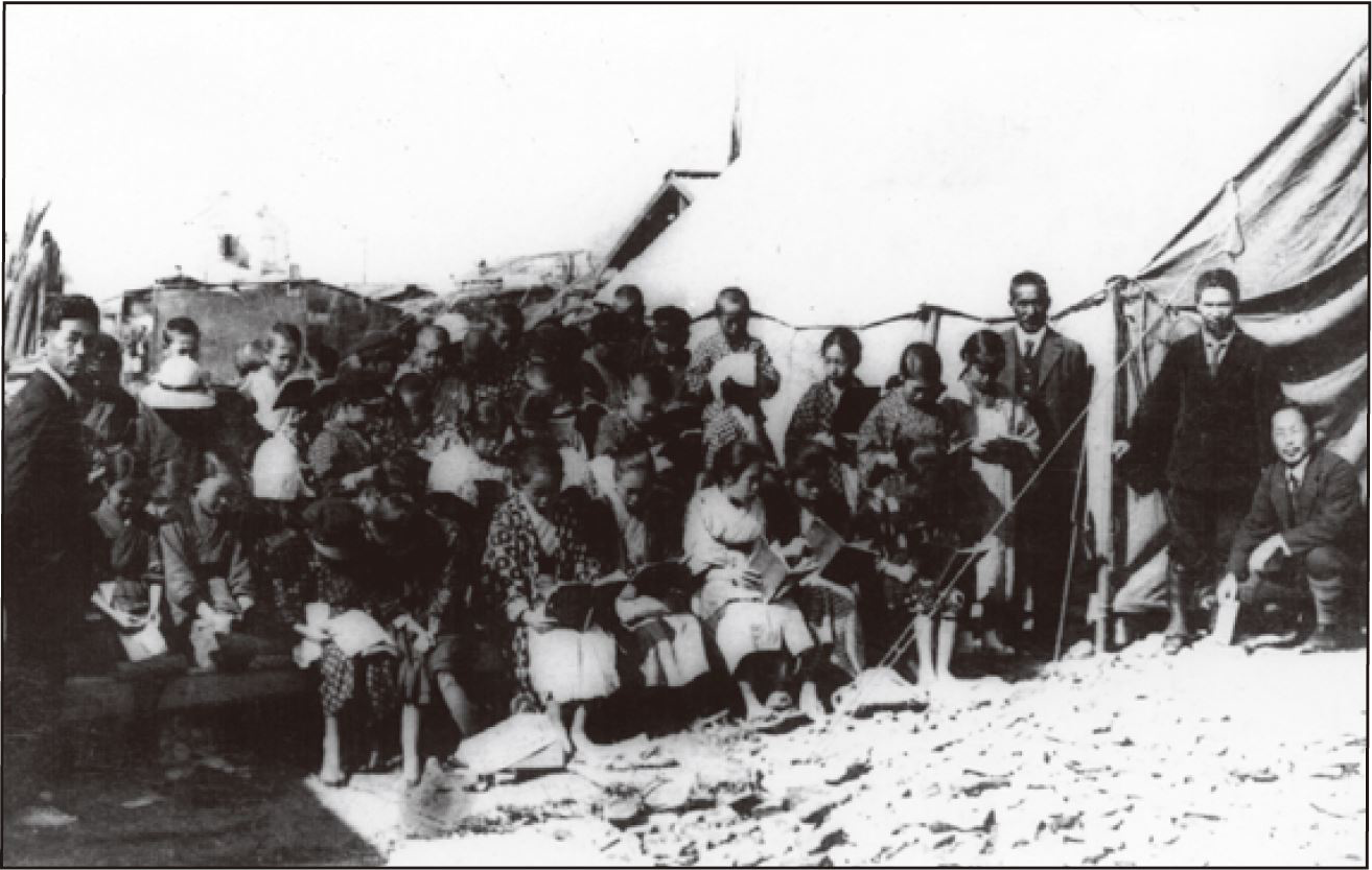 その後、発災から3ヵ月経過する頃には、宗教部、教育部、調査部、社会事業部、無料診療所、配給所、児童給食、体育部、低利融資、組合事業、その他無料宿泊所や巡回看護婦養成の学校など、これだけの機能をもつ組織に組織化されました。