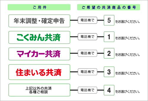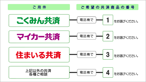 ご用件に応じた番号を入力いただきますと担当者が応対させていただきます。