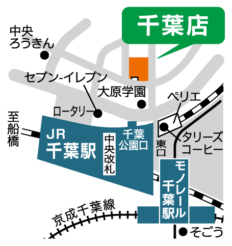 JR千葉駅千葉公園口より徒歩3分です。JR千葉駅中央改札から左へ進み、千葉公園口を下りて右に曲がり、信号のある道路を渡って左側です。(大原学園の後ろ)