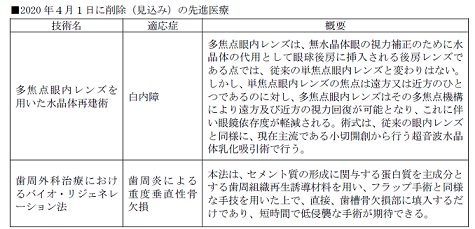 現在、厚生労働省にて2020年度の診療報酬改定に向けて、先進医療の見直しに関する検討が行われています。その中で「多焦点眼内レンズを用いた水晶体再建術」および「歯周外科治療におけるバイオ・リジェネレーション法」(以下「多焦点眼内レンズを用いた水晶体再建術」等)は、「先進医療から削除する方向で検討することが適当である」との評価がなされ、2020年4月1日より先進医療から削除される見込みです。(他の先進医療技術についても削除される可能性があります。最終的な決定は、2020年3月の厚生労働省告示をもってなされる見込みです。)