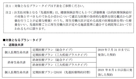 退職後共済(個人長期生命共済および終身生命共済)の先進医療共済金(先進医療費用共済金)(注1)は、療養を受けた時点において厚生労働大臣が定める先進医療(注2)であることを共済金の支払事由としています。そのため、「多焦点眼内レンズを用いた水晶体再建術」等が「先進医療」から削除された場合、2020年4月1日以降に受ける「多焦点眼内レンズを用いた水晶体再建術」等は、ご契約の発効日に関わらず、先進医療共済金(先進医療費用共済金)の支払対象外となります。