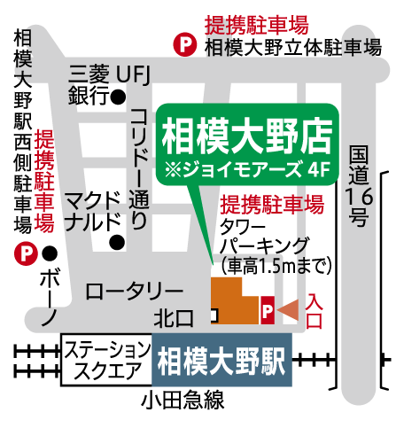 小田急線相模大野駅下車徒歩1分。駅を出て、右手ジョイモアーズ4階です。