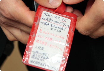私はこれまでに2度大きな病気にかかり、病院のお世話になっています。最初は2011年8月。脳出血で倒れてしまい、救急車で運ばれて一命をとりとめました。その後、療養期間を経た2012年5月に、今度は心筋炎にかかり、心肺停止の状態で救急病院に運ばれました。後で聞いたのですが、運ばれる途中で意識を失って、救急車の中で8回救命処置を試みても心臓が動かなかったそうです。意識を取り戻したのは5日後。その間のことは一切記憶にないのですが、本当に今こうして生きているのは奇跡だそうで、そのとき呼び集められた家族は、医師から「覚悟してください」と伝えられていたようです。今も緊急時に周囲の人に助けを求めるためのメッセージ・カードを常に携帯しています。