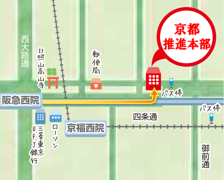 阪急西院駅下車、四条通沿いに東へ徒歩約5分。四条御前バス停・京福西院駅下車すぐ。