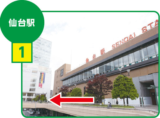JR「仙台」駅2F西口を出て右に進みPARCOさん方面へ直進します。