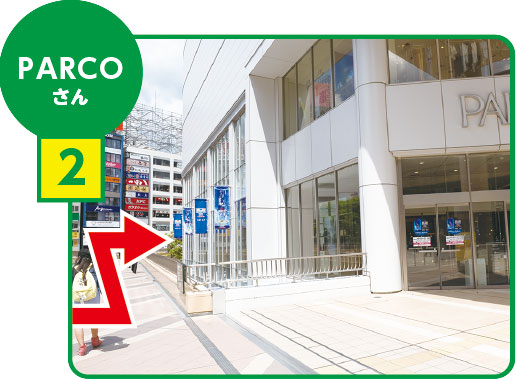 2FのペデストリアンデッキからPARCOさん向かいの歩道橋を吉野家さん方面へ降ります。