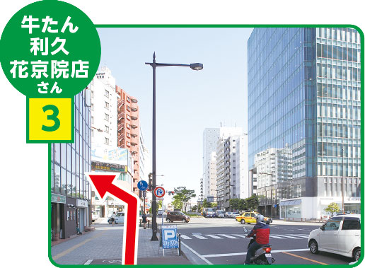 広瀬通の信号を花京院方面へ直進し、「牛たん利休花京院店」さんが見えたら、その十字路を左折します。