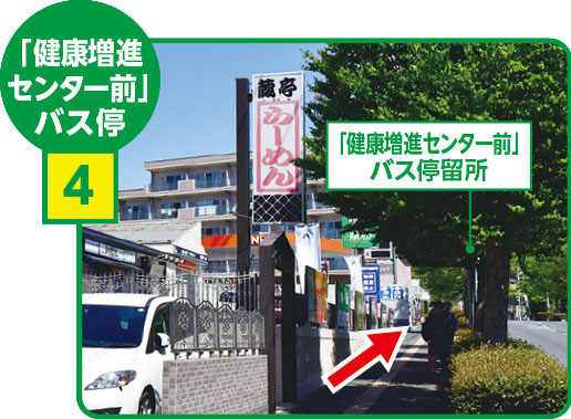 直進すると蔵亭さんの「らーめん」看板が見え、「健康増進センター」バス停があります。
