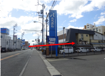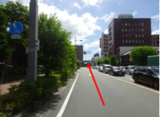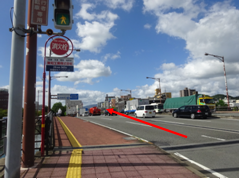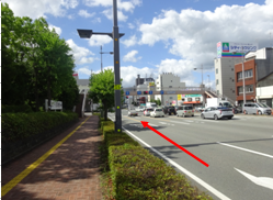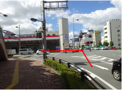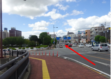⑤直進すると歩道橋が見えるので、歩道橋を超えたところにあるガソリンスタンドの前を左折します。