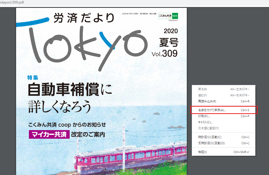 別ウインドウで開かれたPDFファイルをウインドウ上で右クリックし「名前を付けて保存(ctrl+S)」で保存します。