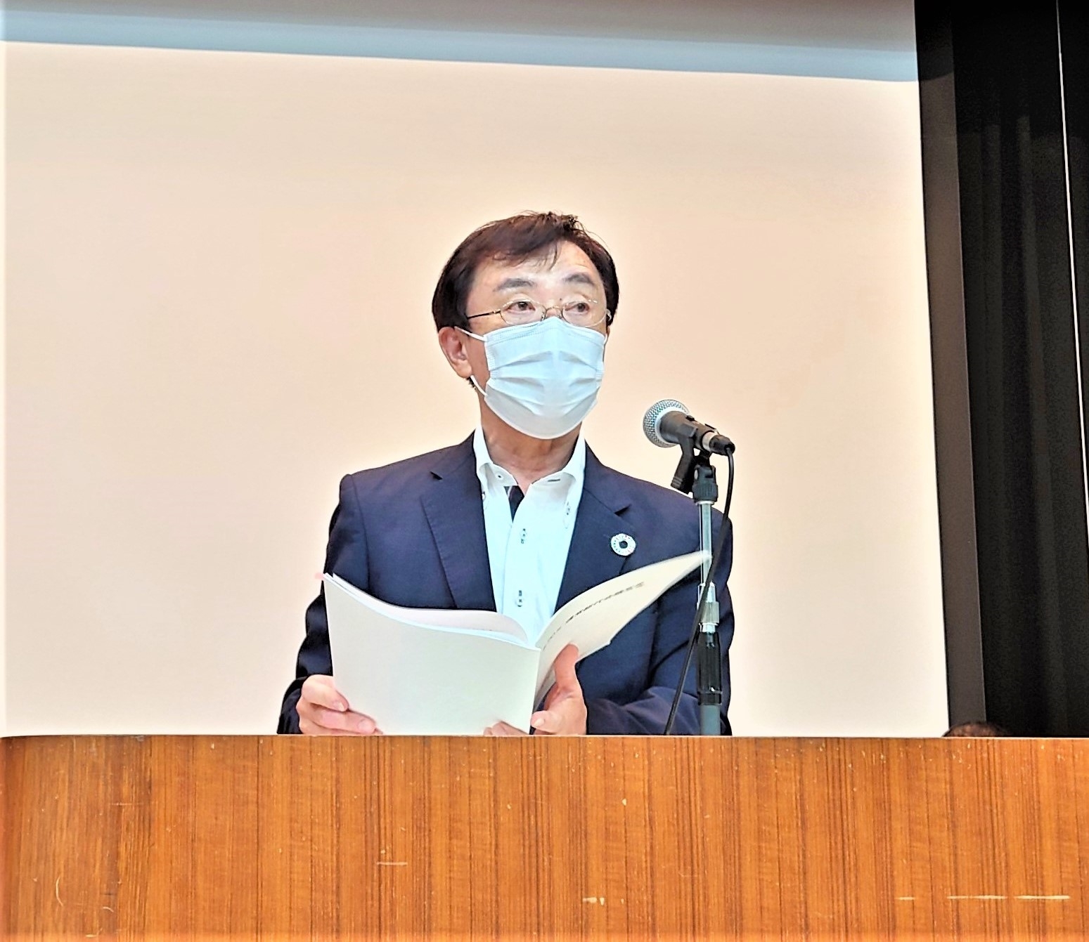 【理事会を代表して挨拶する二階堂 健男 理事長】