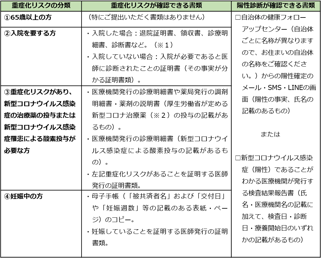 ①65 歳以上の方 ②入院を要する方 ③重症化リスクがあり、新型コロナウイルス感染症の治療薬の投与または新型コロナウイルス感染症罹患による酸素投与が必要な方(新型コロナウイルス感染症の治療薬、酸素投与があっても、保健所への発生届の対象となっていない場合はご請求いただけません。) ④妊婦の方