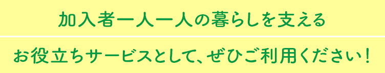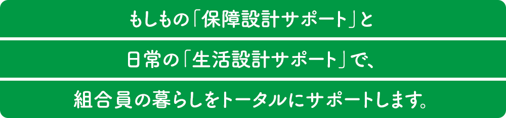 保障設計サポート 一人一人に寄り添った、最適な保障設計をサポートします。こくみん共済 coop 職員だけでなく、ご自身でも検討することが可能です。 生活設計サポート 「生活全般のサービス」により、「もしも」以外のいつもの生活(日常)においても、組合員の皆さまへのお役立ちができる内容です。 こくみん Lifeサポートは、当会の組合員がご利用になれるサービスです。離退職後の方につきましても「保障を継続」いただくことで、引き続きサービスをご利用になれます。 こくみん Lifeサポート特設サイト